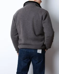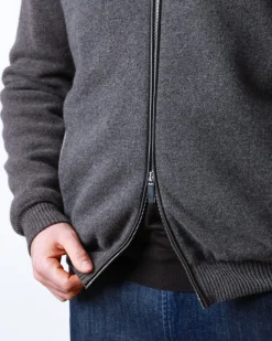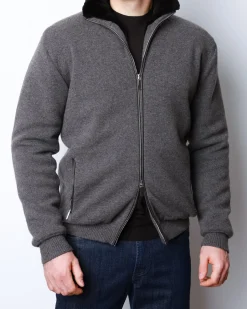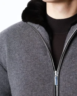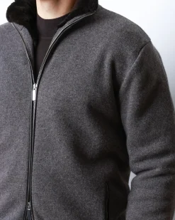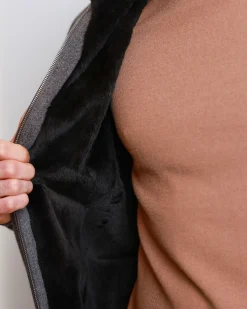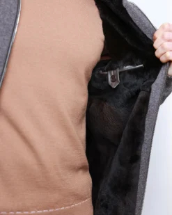 Чоловіча куртка з 100% кашеміру з повною підкладкою з натурального хутра бобра. Має подвійний металевий замок, м’які трикотажні манжети та елегантний графітово-сірий колір.