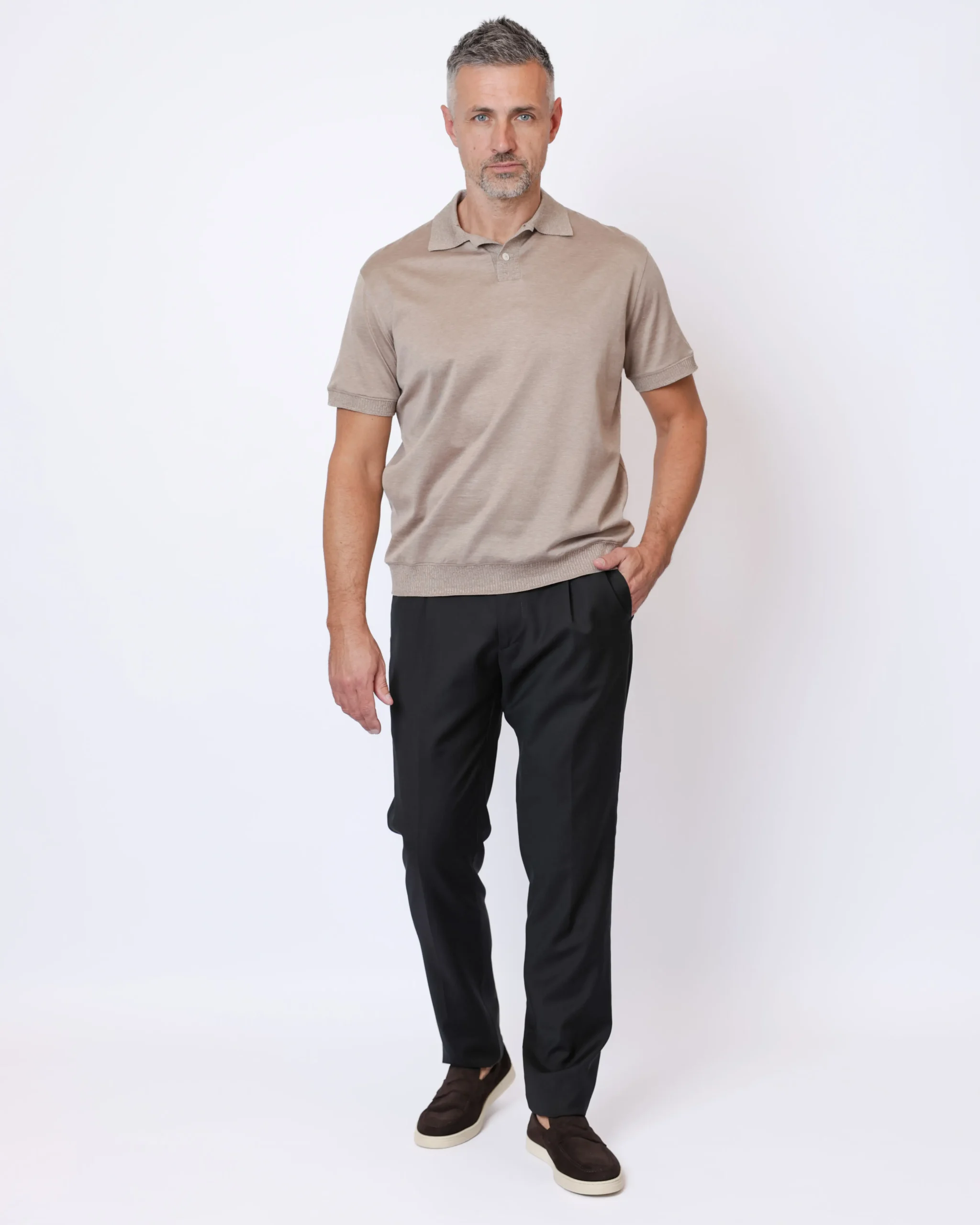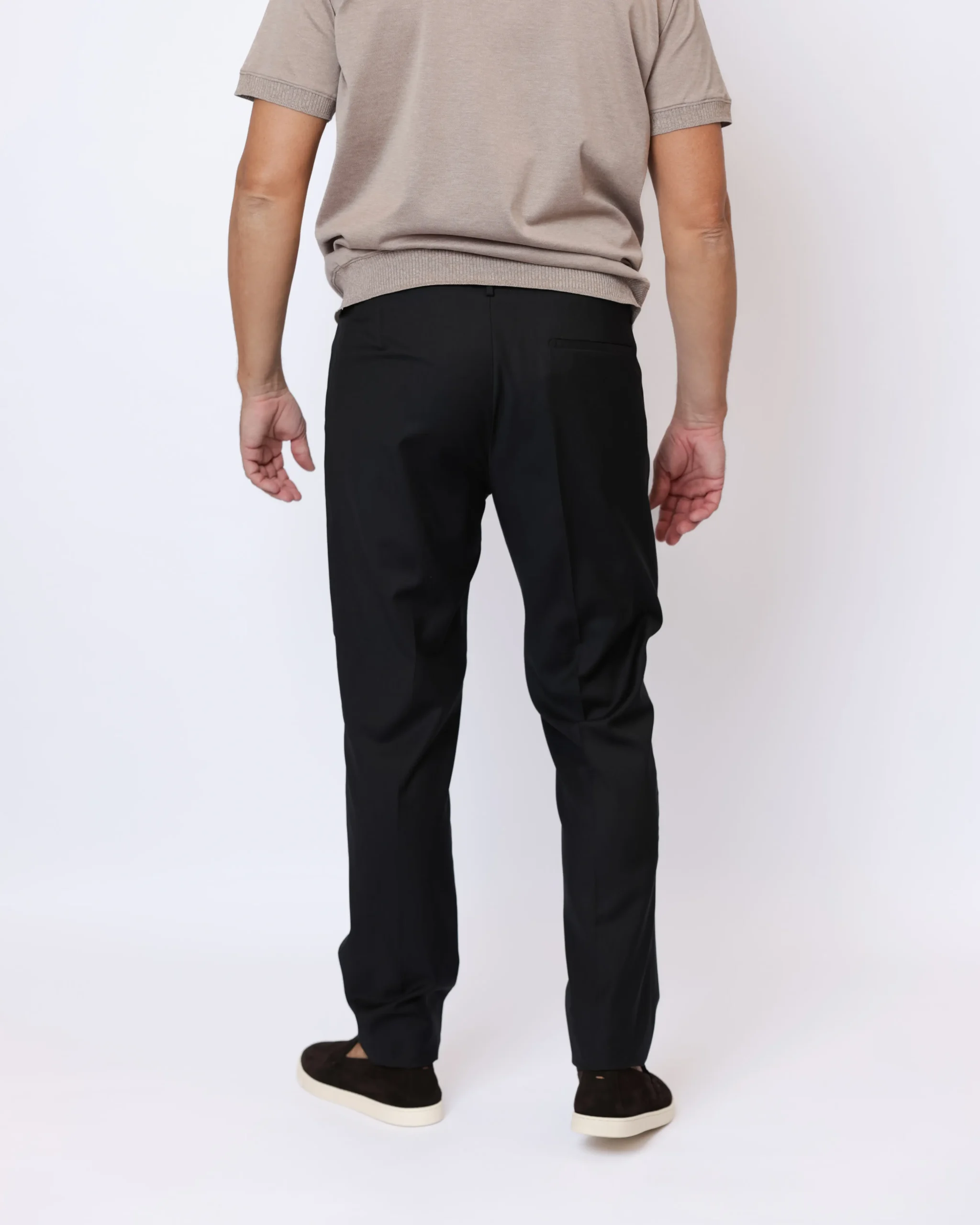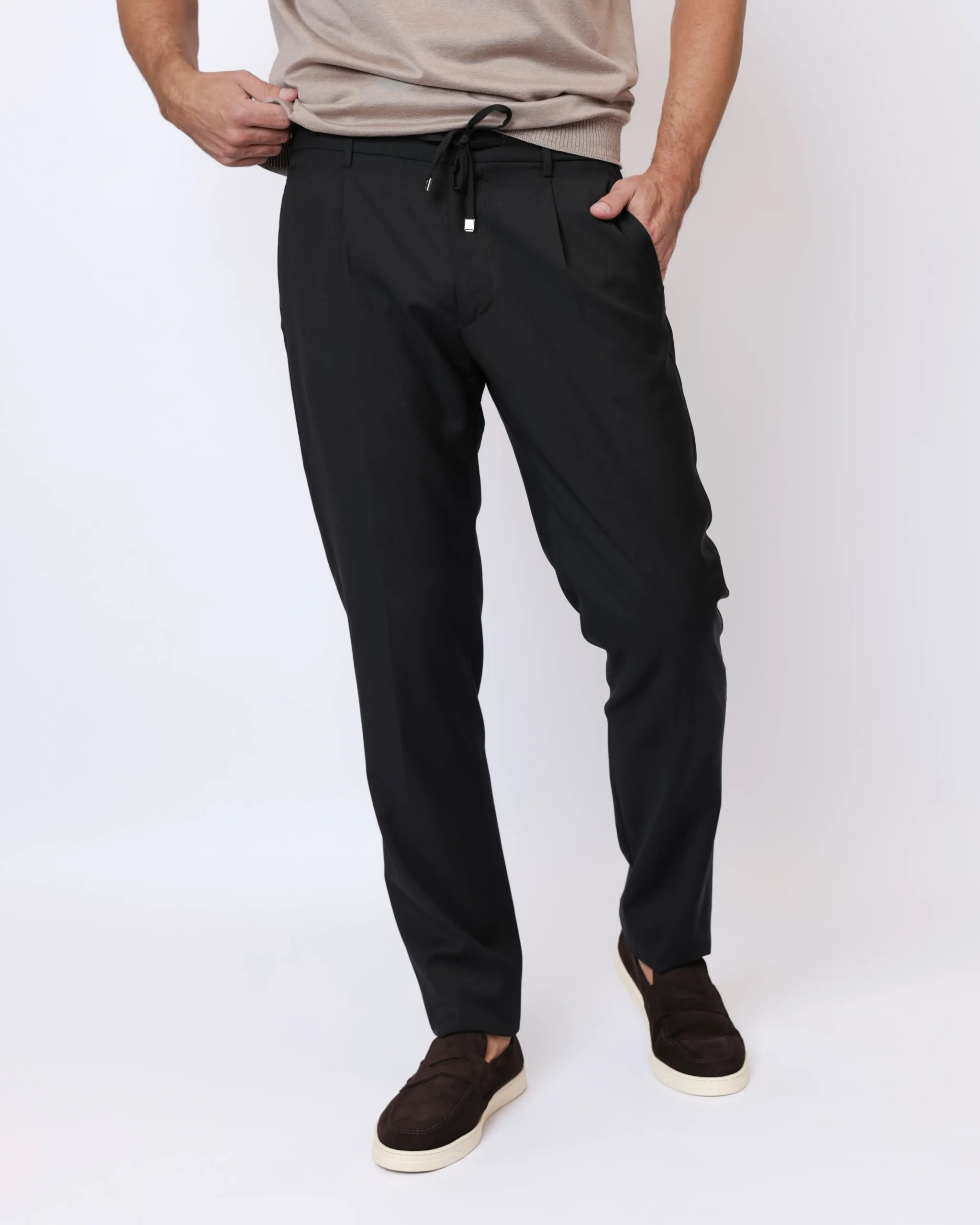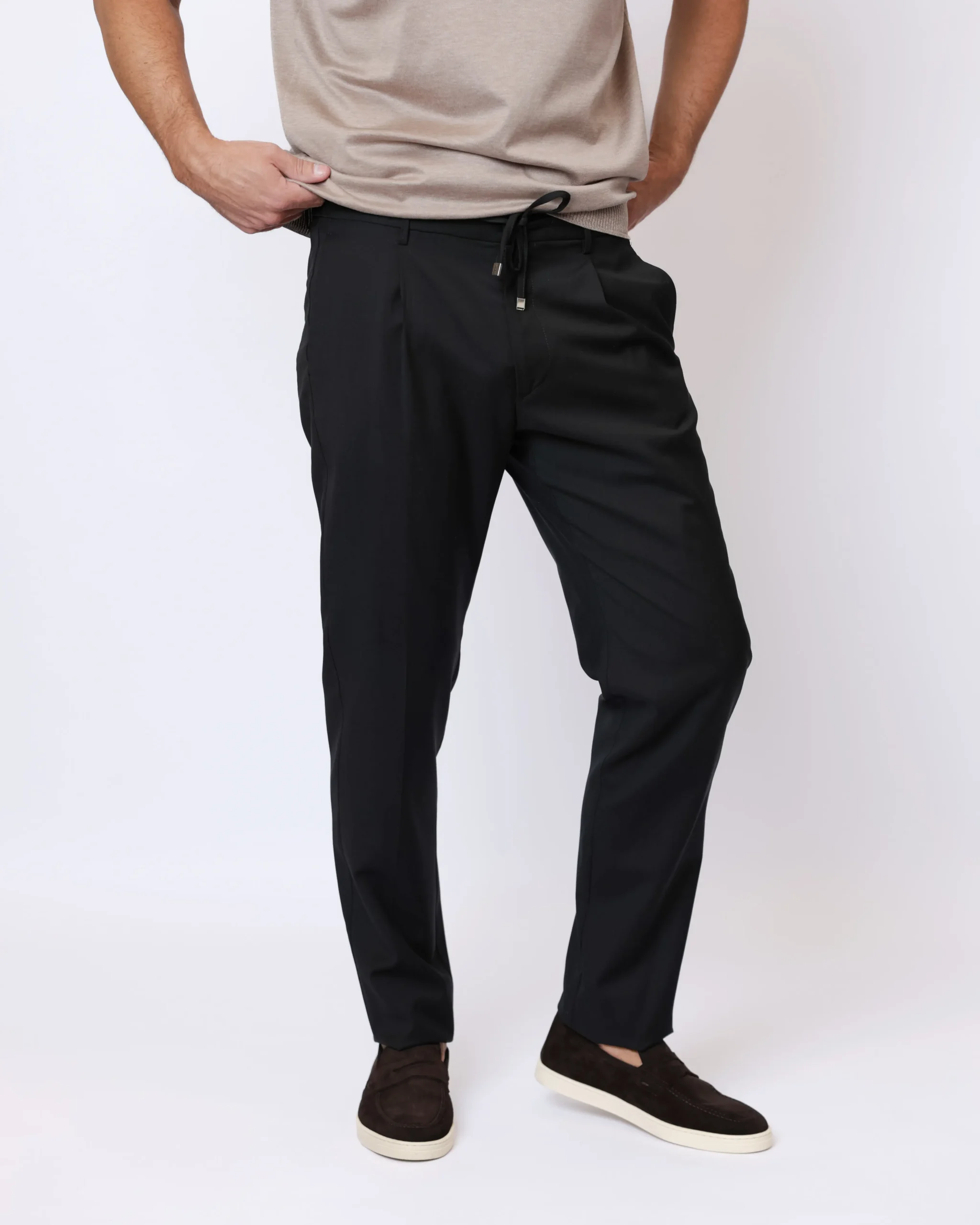 Чоловічі брюки виконані з легкої вовняної тканини з додаванням еластану, що забезпечує комфортну посадку та свободу рухів. Модель із поясом на кулісці поєднує класичний стиль і сучасний casual характер.