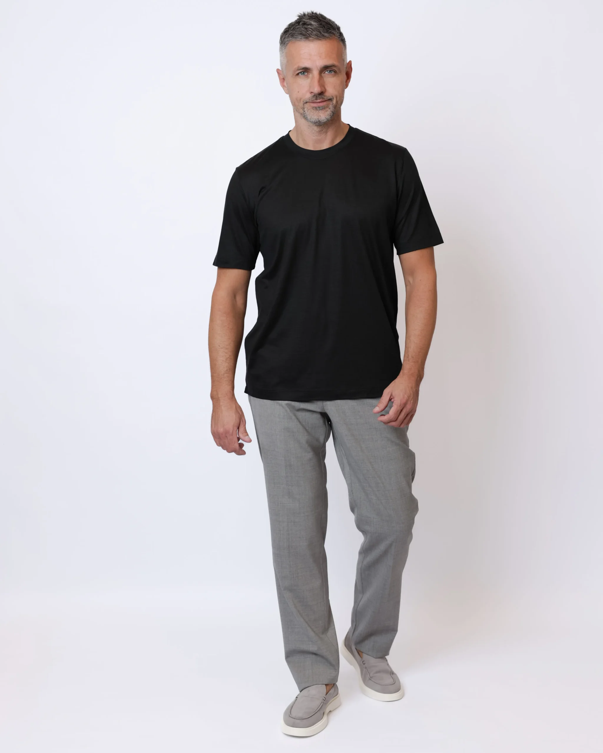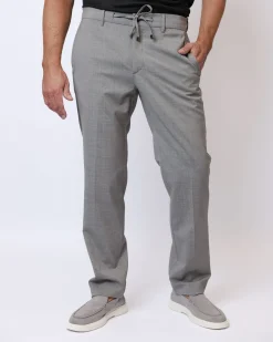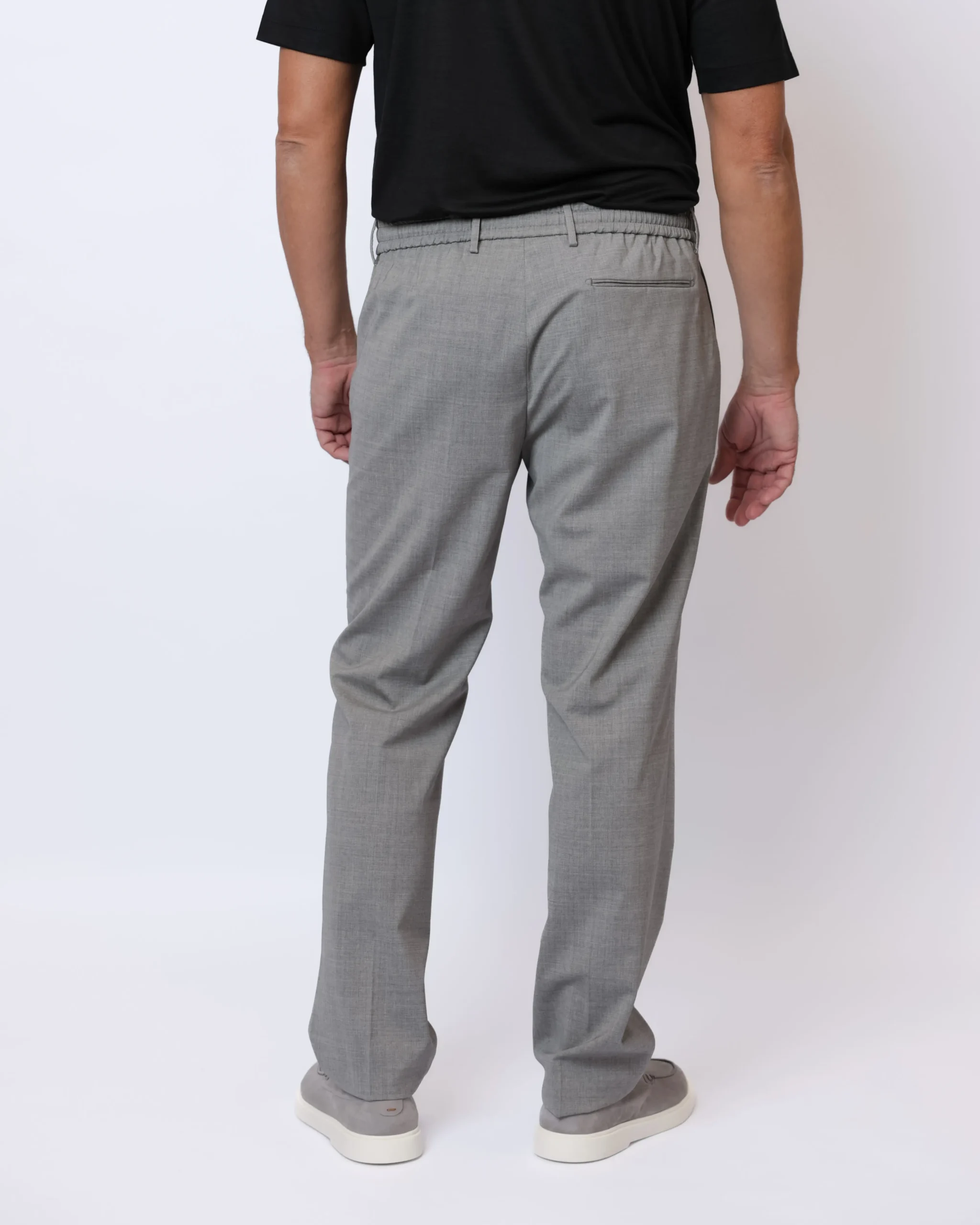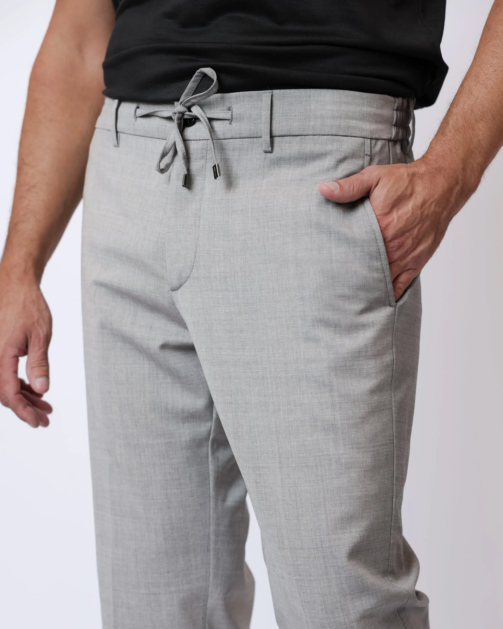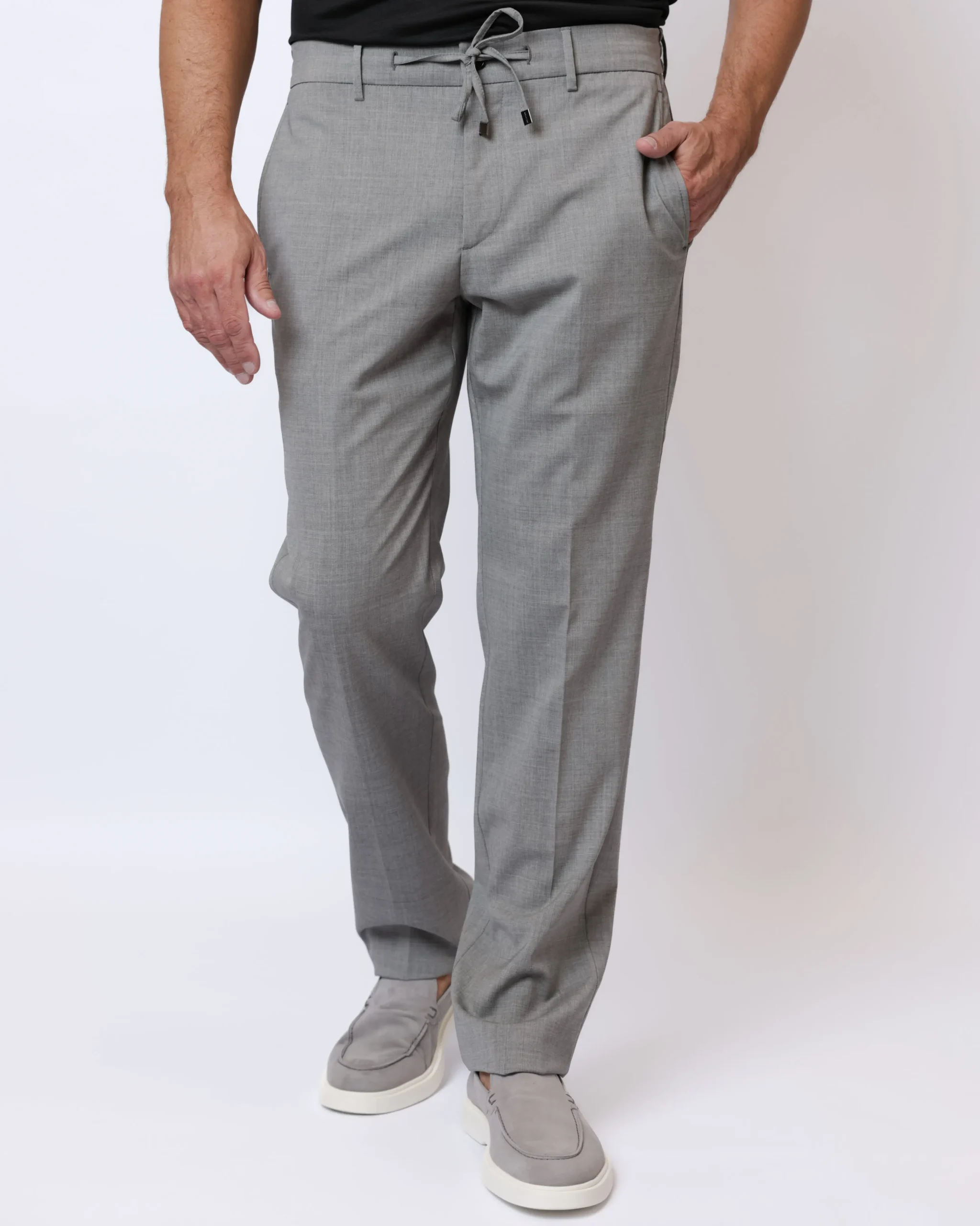 Елегантні брюки Berwich виконані з легкої вовняної тканини у світло-сірому відтінку. Модель поєднує класичний силует і комфорт casual стилю завдяки еластичному поясу з куліскою. Ідеальний варіант для сучасних образів smart casual.