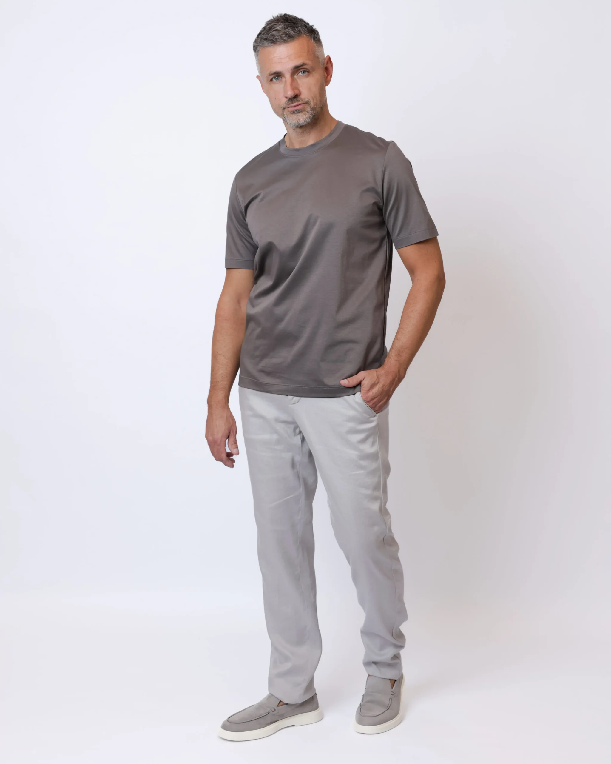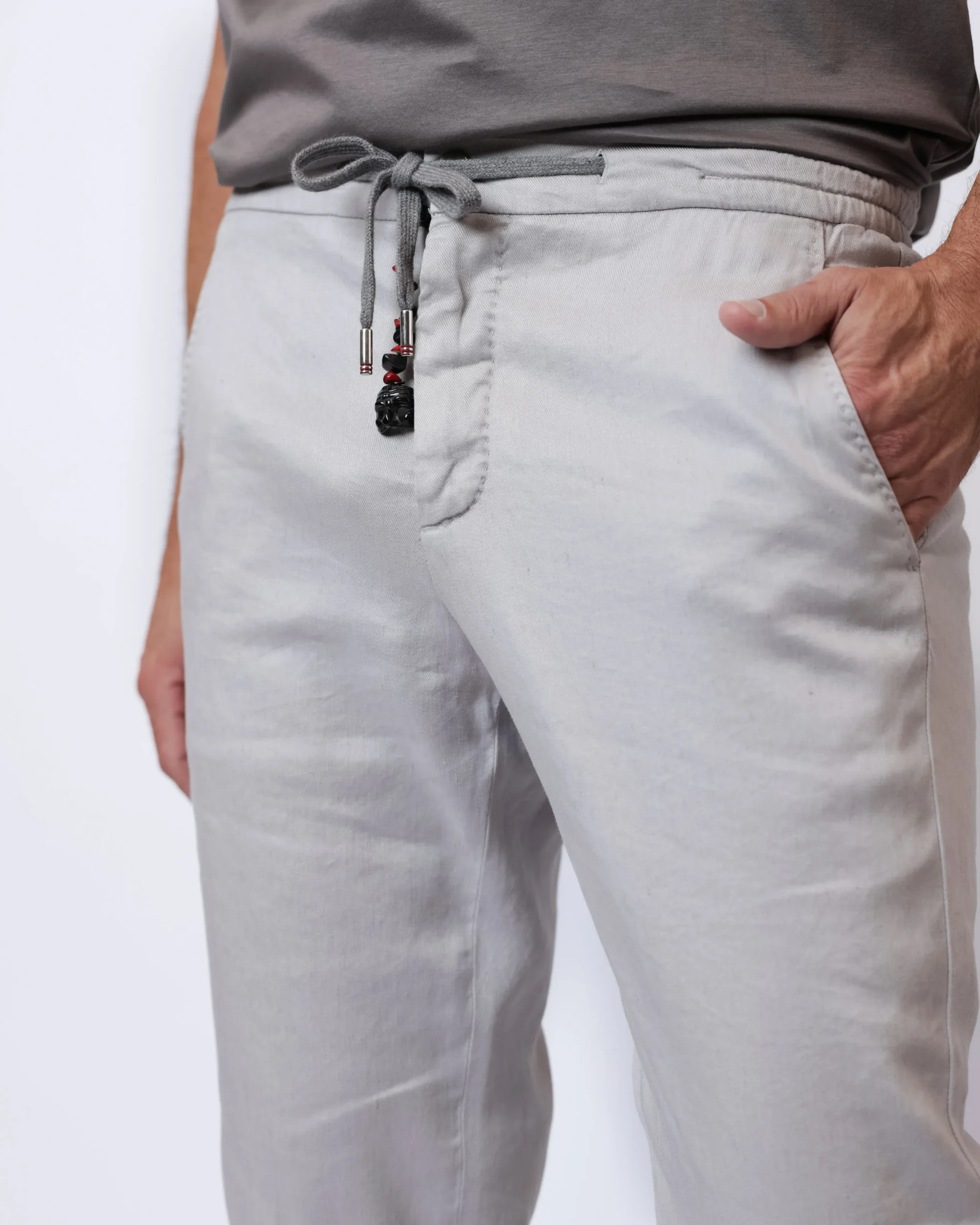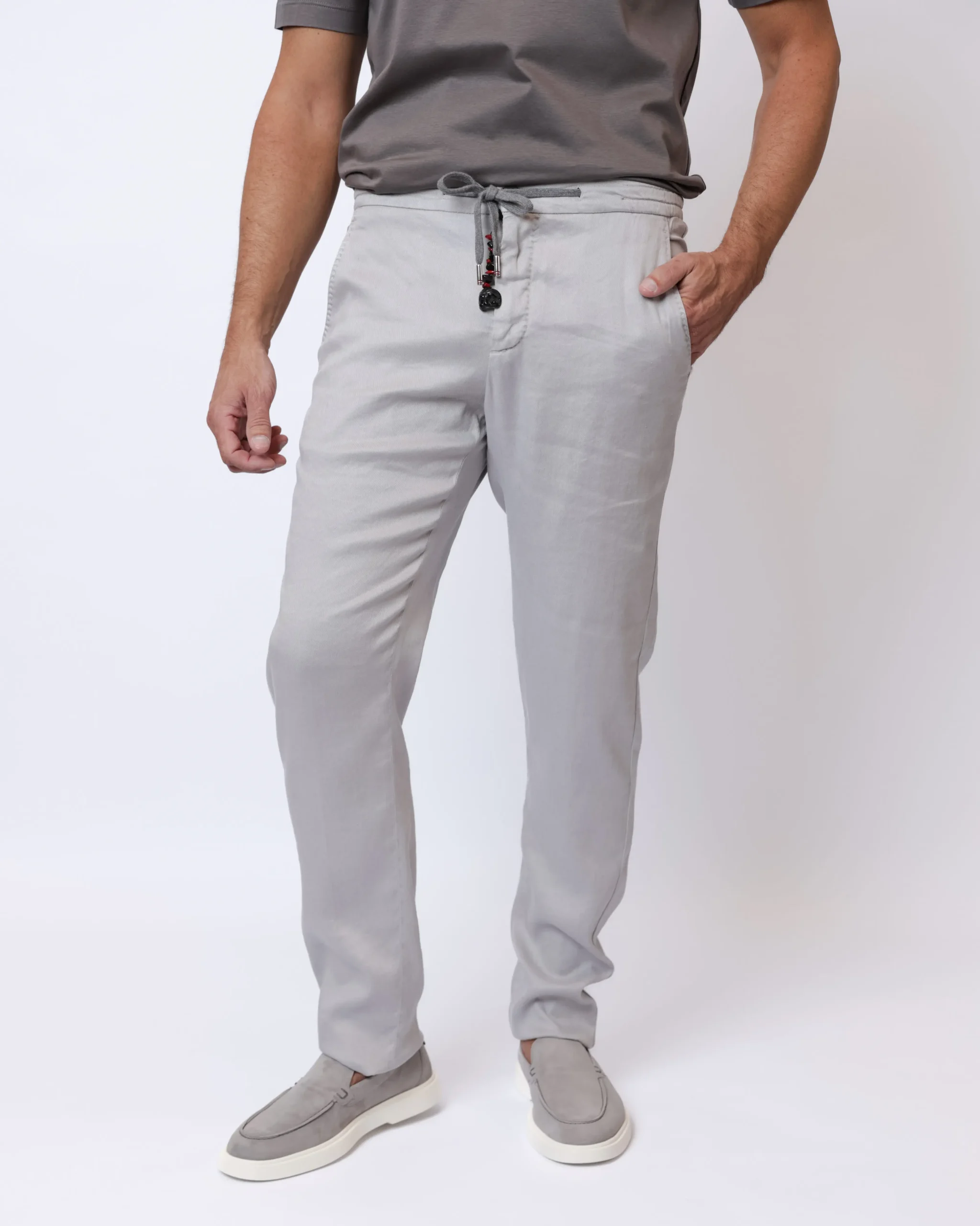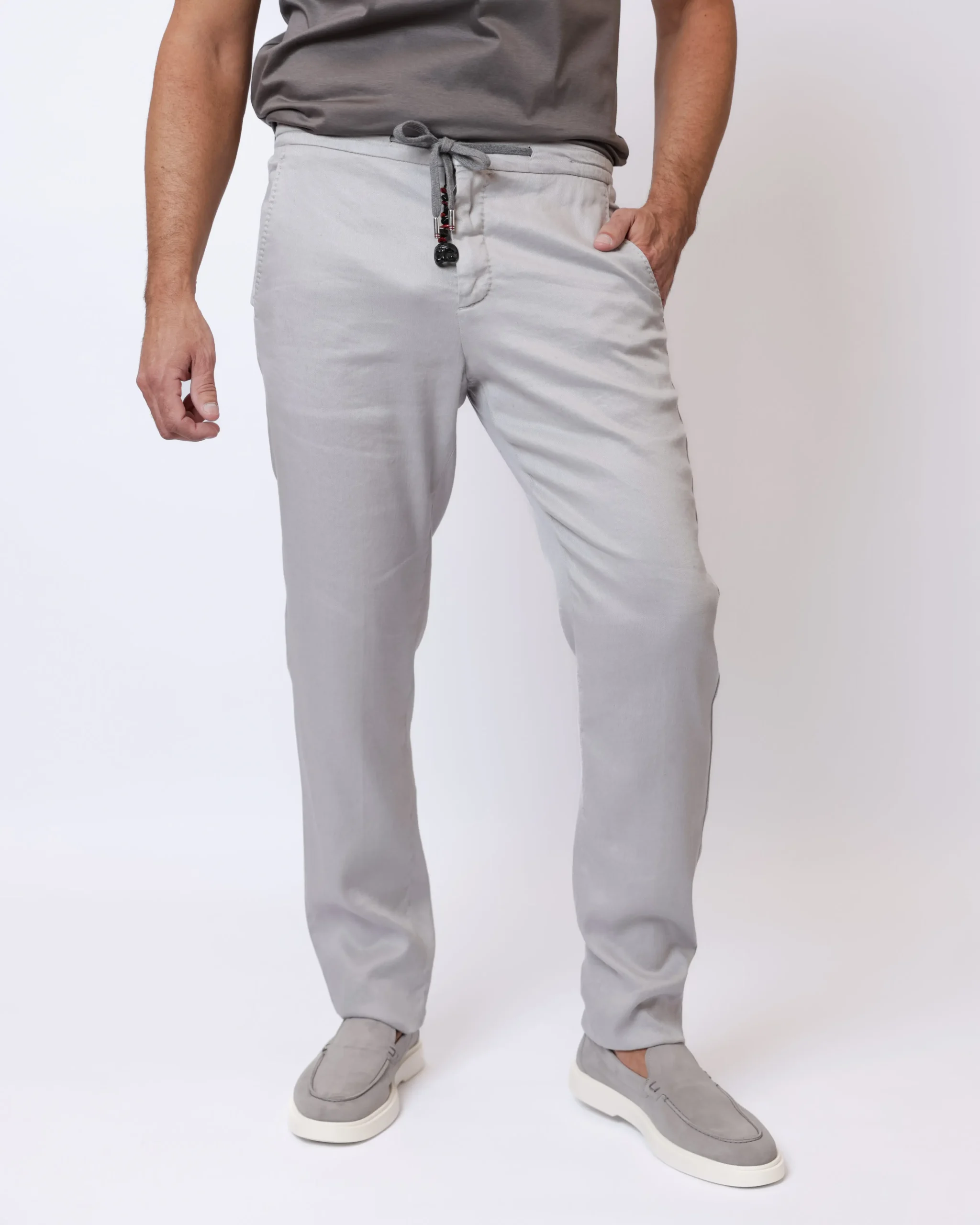 Легкі літні брюки з натурального льону. Модель виконана у світлому холодному відтінку stone grey і поєднує елегантність італійського стилю з комфортом повсякденного носіння.
