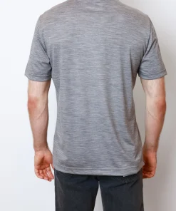 Модель має класичний прямий крій із коротким рукавом та округлою горловиною. Тканина має легку меланжеву текстуру у сірому відтінку, яка додає глибини кольору та вишуканості. Краї оброблені акуратними пласкими швами, що підкреслює преміальну якість виробу.