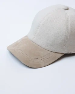 Кепка молочного кольору з контрастним замшевим козирком, має регульовану застібку для зручної посадки.