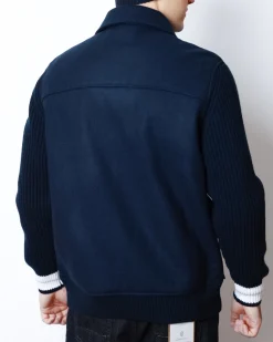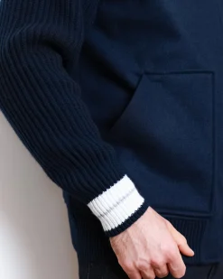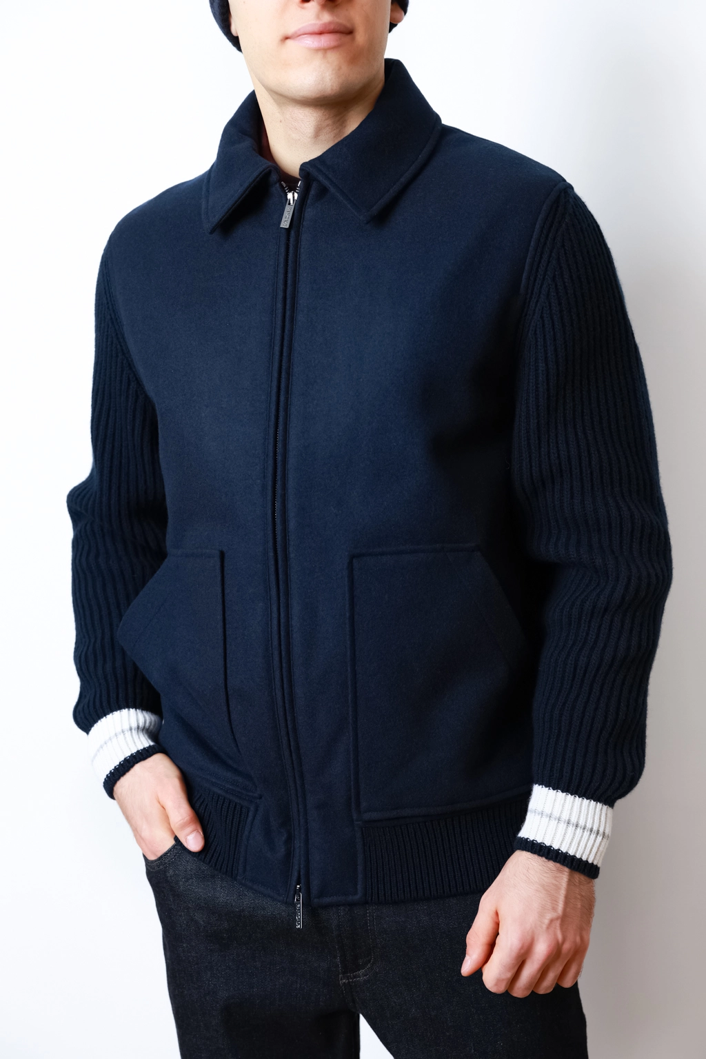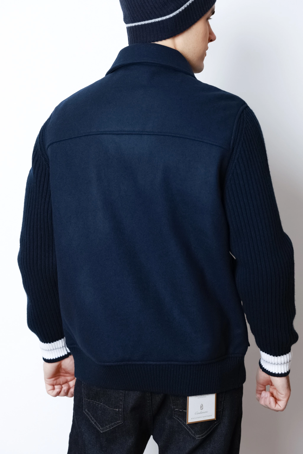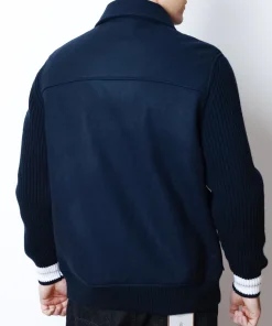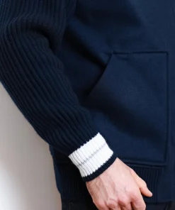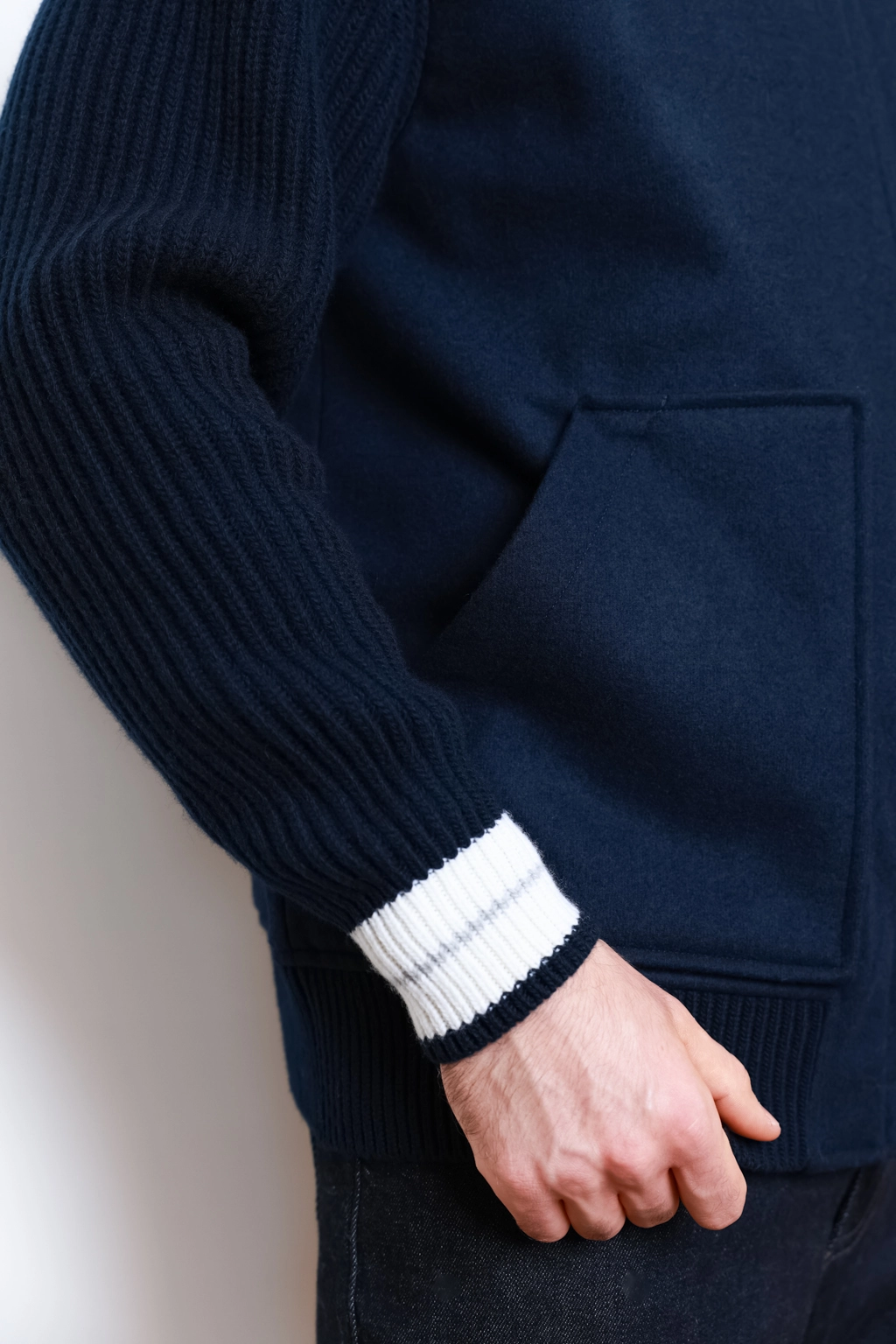Модель виконана у глибокому темно-синьому кольорі. Передня частина гладка, із щільної вовни, а рукави — трикотажні, з об’ємним ребристим в’язанням, що додає виробу текстурності та динаміки. Контрастні манжети білого кольору з тонкою сірою смугою створюють стильний акцент.