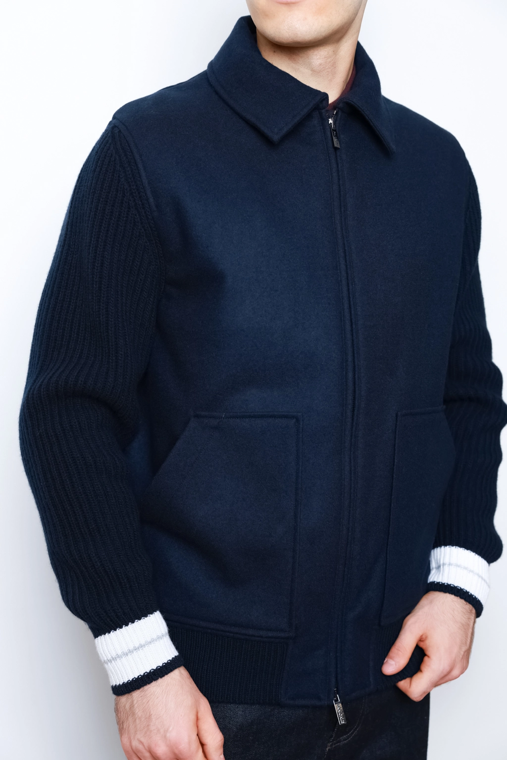 Чоловіча вовняна куртка — стильна модель з гладким корпусом і трикотажними рукавами. 100% вовна, застібка-блискавка, накладні кишені та контрастні манжети.