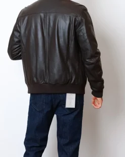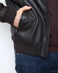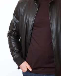 Куртка Buonamassa зі 100% натуральної шкіри у темно-шоколадному відтінку. Модель на блискавці з коміром-стійкою та еластичними манжетами, всередині підкладка з міксу бавовни й поліестеру для комфорту та практичності.