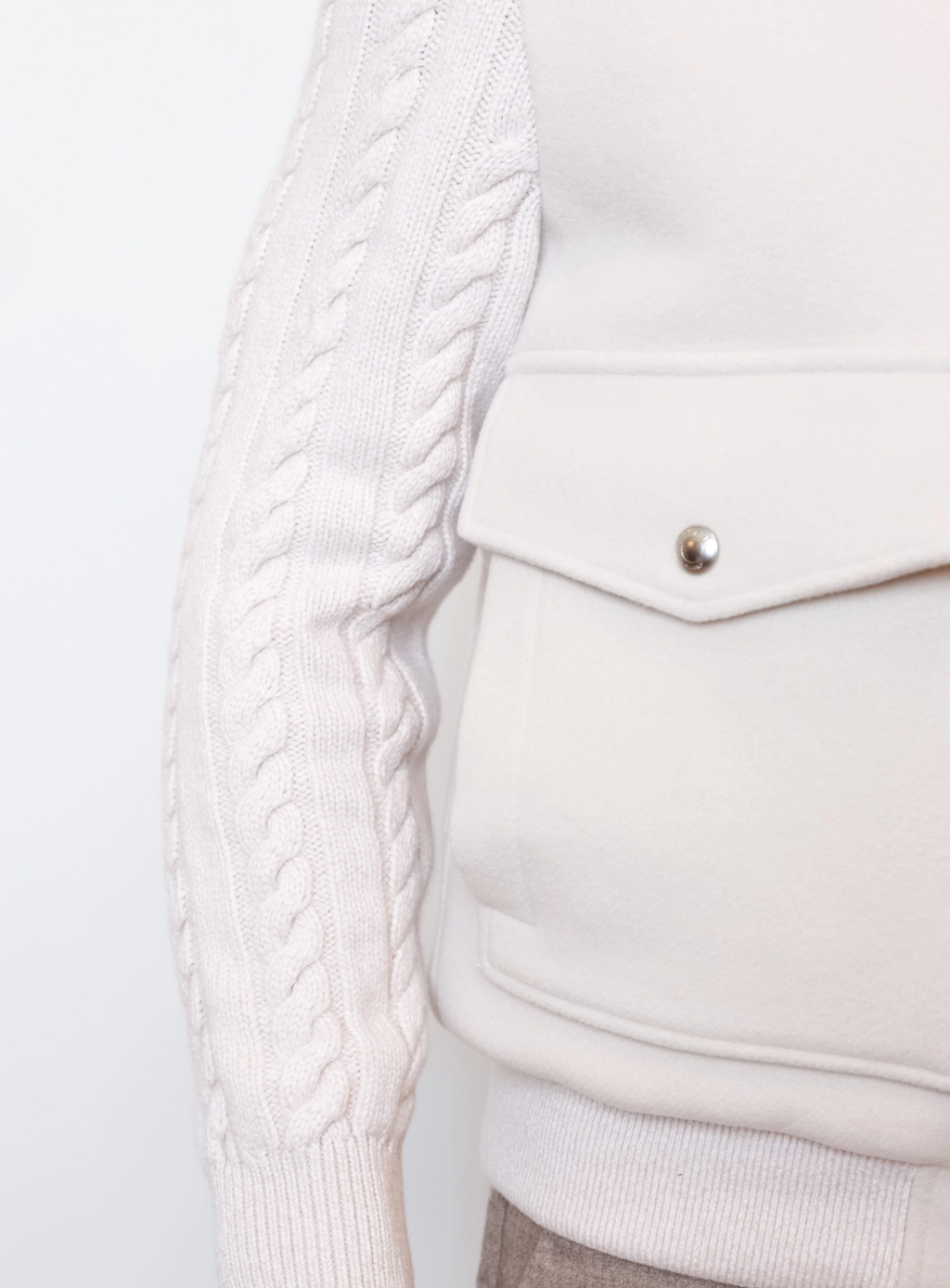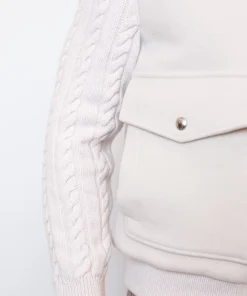 Основна частина виготовлена з суміші вовни та кашеміру з додаванням поліаміду для зносостійкості. В’язані рукава з вовни, віскози та кашеміру роблять силует сучасним і надають образу динамічності.