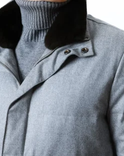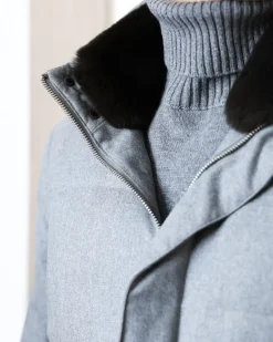 Зимова куртка з італійської вовни Vitale Barberis Canonico. Утеплювач — 90% пух, 10% перо. Знімний комір із натурального хутра кролика рекс, еластичні манжети та пояс.