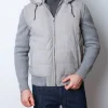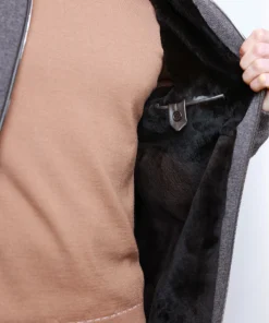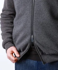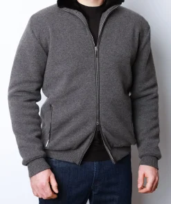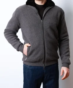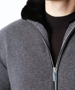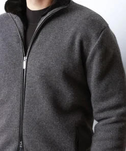 Чоловіча куртка з 100% кашеміру з повною підкладкою з натурального хутра бобра. Має подвійний металевий замок, м’які трикотажні манжети та елегантний графітово-сірий колір.