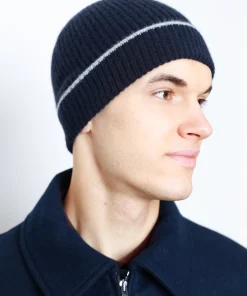 Шапка Panicale з натурального кашеміру у глибокому темно-синьому кольорі. Має еластичну рельєфну в’язку, акуратний відворот і декоративну світло-сіру смугу.