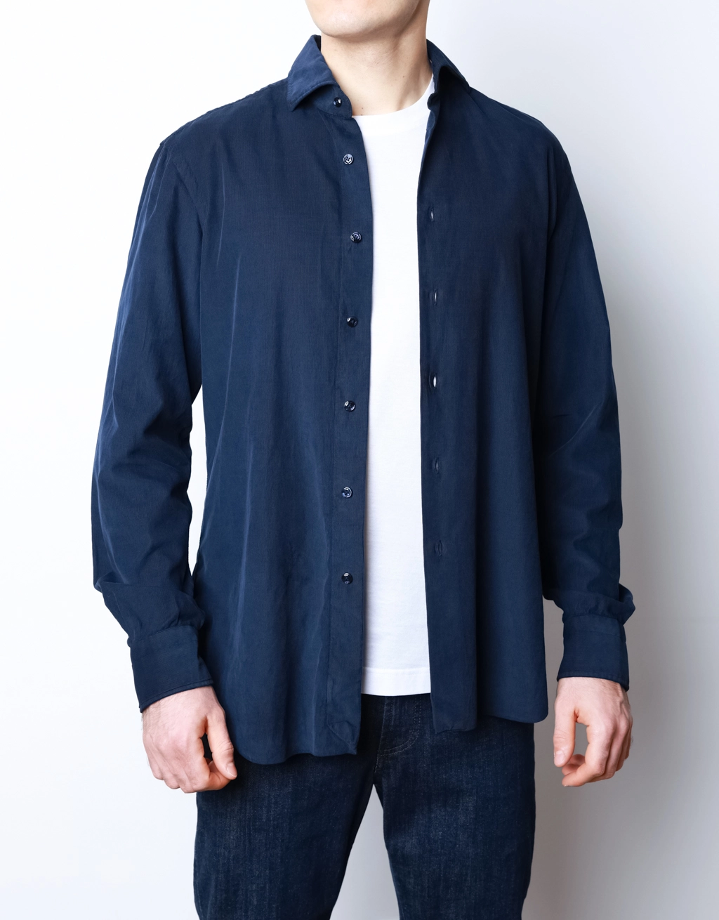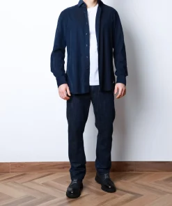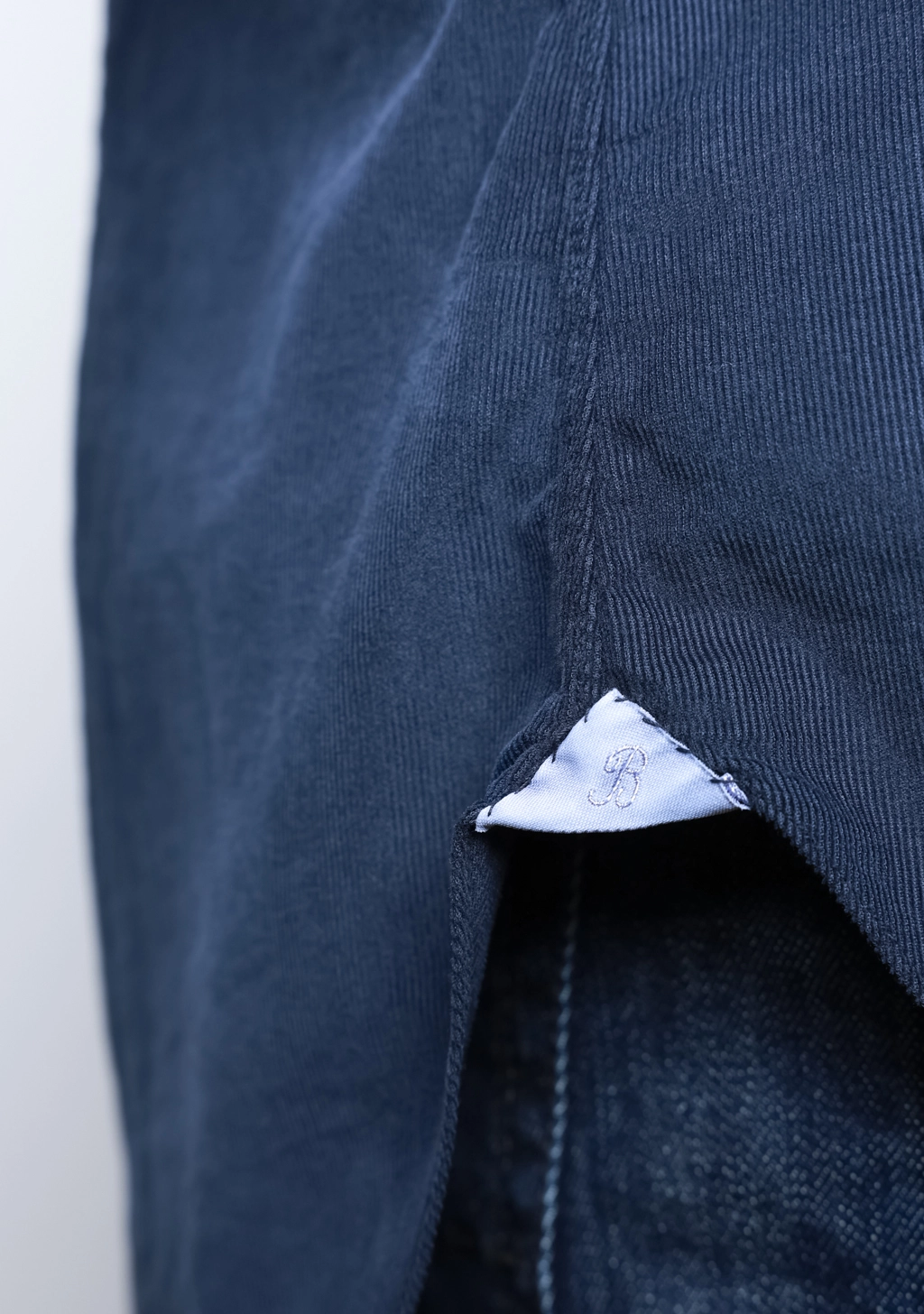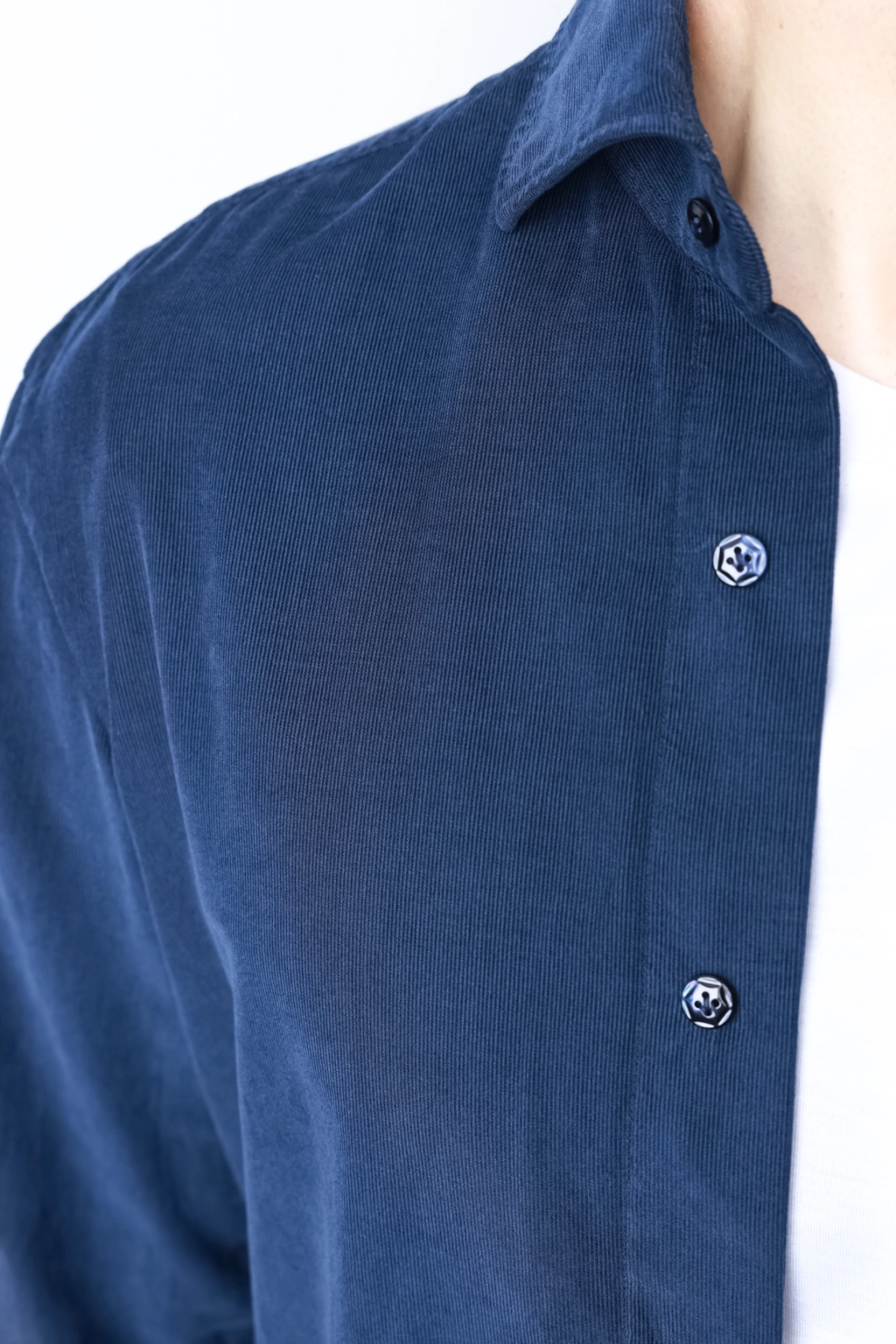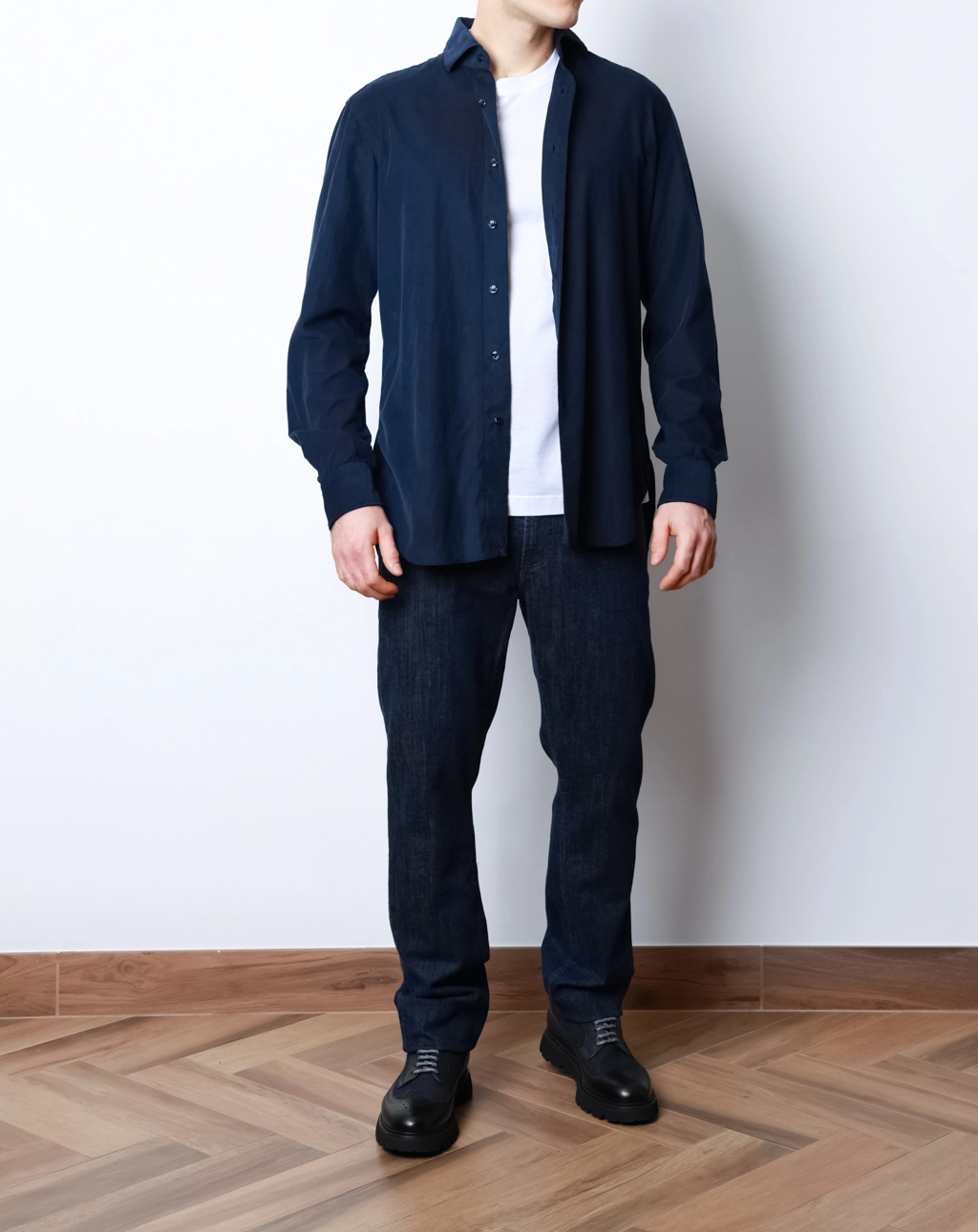 Глибокий синій відтінок створює стриманий, шляхетний образ і легко поєднується як з денімом, так і з класичними брюками. Посилена комірна зона, преміальні гудзики та фірмовий декоративний елемент на нижньому краї підкреслюють ручну увагу до деталей — характерну рису італійського ательє.
