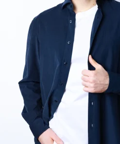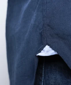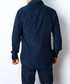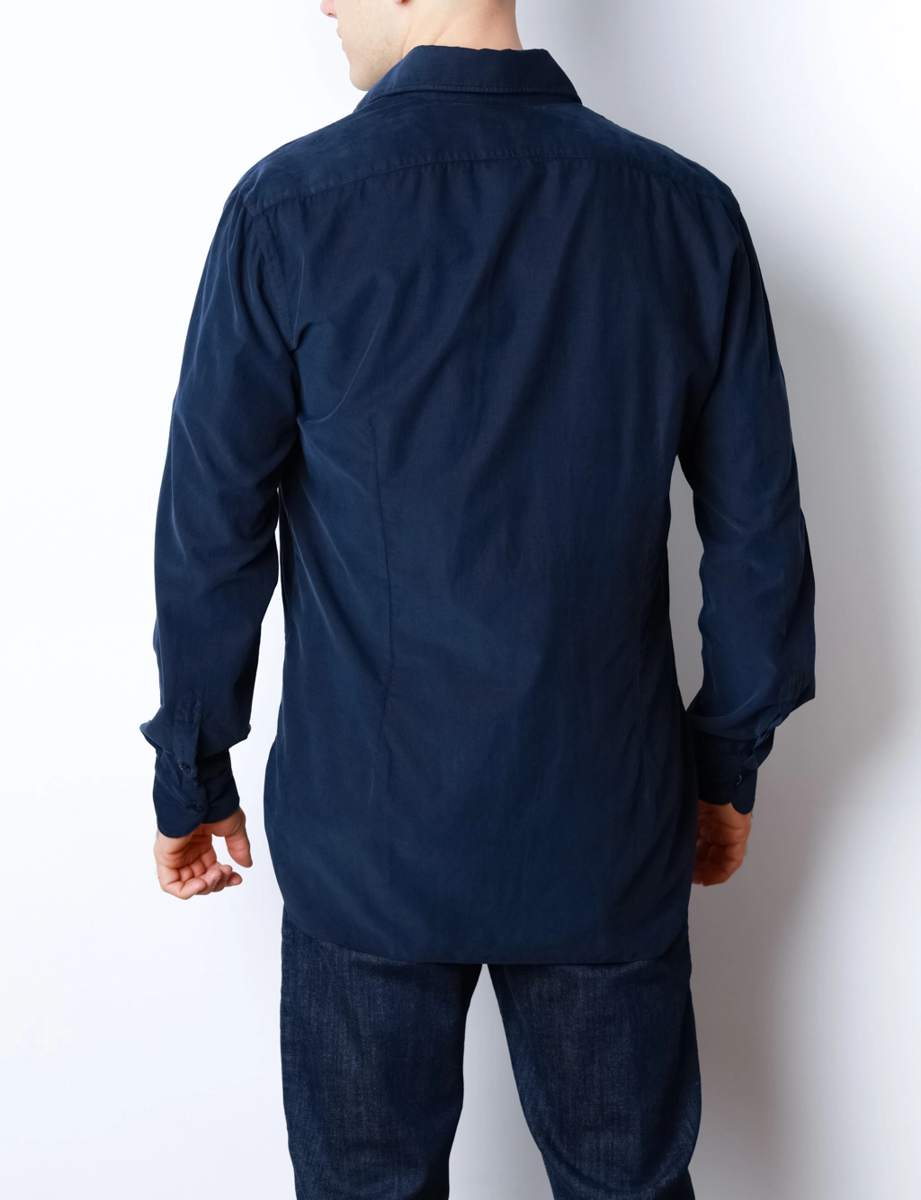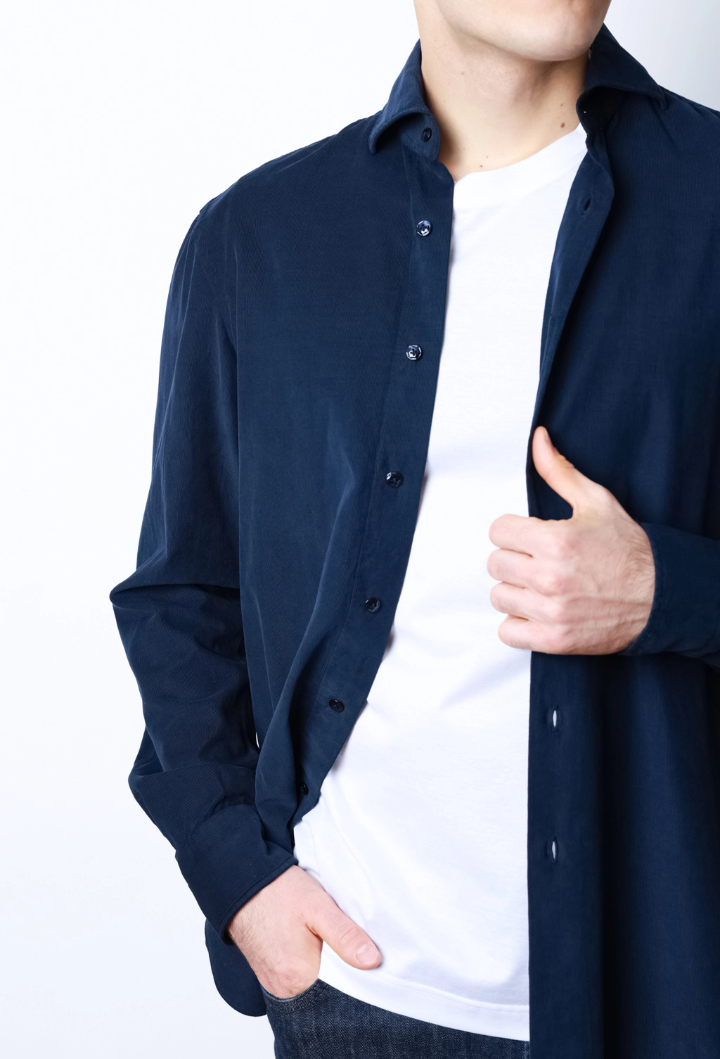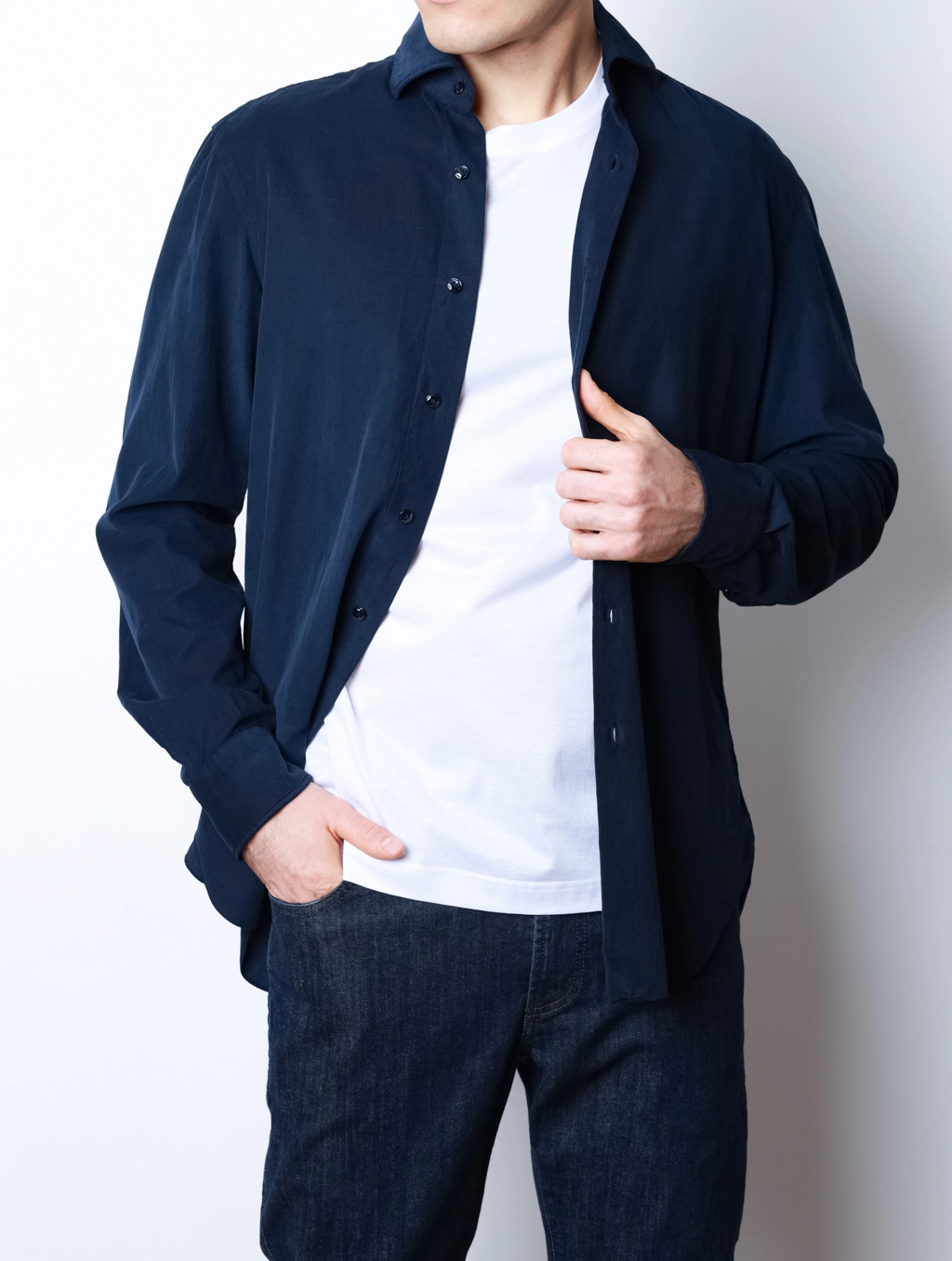 Глибокий синій відтінок створює стриманий, шляхетний образ і легко поєднується як з денімом, так і з класичними брюками. Посилена комірна зона, преміальні гудзики та фірмовий декоративний елемент на нижньому краї підкреслюють ручну увагу до деталей — характерну рису італійського ательє.