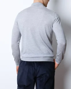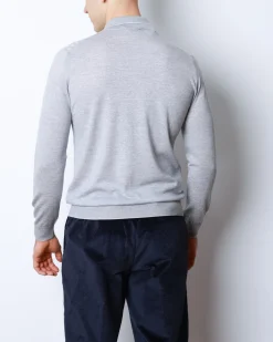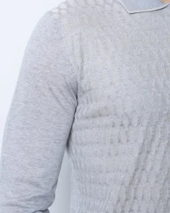 Преміальне чоловіче поло з довгим рукавом із вовни та шовку у світло-сірому відтінку. Фактурний перед із геометричним узором, металевий блискавковий комір та еластичні манжети.