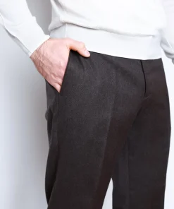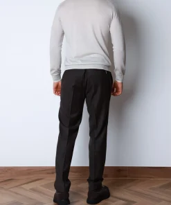 Виконані зі 100% високоякісної вовни італійського виробництва, брюки мають надзвичайно м’яку, гладку поверхню з тонким матовим блиском. Така тканина приємна до тіла, чудово тримає форму й дихає, забезпечуючи комфорт навіть під час тривалого носіння. Крій — вивірений і анатомічний, з м’яким об’ємом у стегнах та стрілками, що додають фігурі структури.
