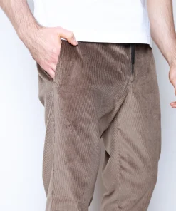 Крій — вільний regular fit з еластичним поясом і шнурком для регулювання посадки. Вертикальні лінії вельветового рубчика візуально подовжують силует, підкреслюючи ноги.