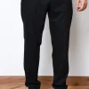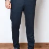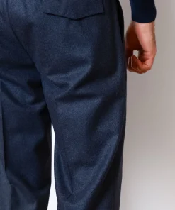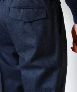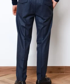 Штани з 100% вовни у темно-синьому кольорі. Мають еластичний пояс зі шнурком, бокові кишені та задні кишені з клапанами на ґудзиках.