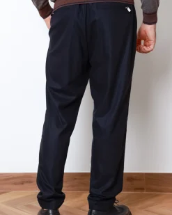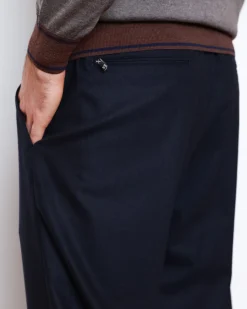 Брюки Marco Pescarolo з преміальної тканини: 90% вовна, 8% кашемір, 2% еластан. Мають еластичний пояс зі шнурком, прямий крій та глибокий темно-синій колір.
