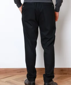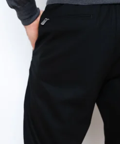 Модель виконана у сучасному стилі зі злегка звуженим кроєм, має еластичний пояс зі шнурком для регулювання, що підкреслює поєднання класики з комфортом. Бокові кишені додають практичності, а акуратні задні кишені на блискавках підкреслюють вишуканий характер виробу. Гладка фактура тканини та насичений чорний колір роблять ці штани універсальною базою як для ділових луків, так і для smart-casual образів.