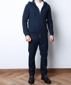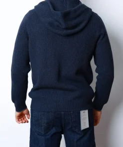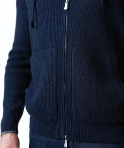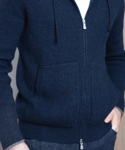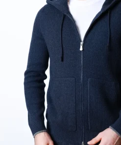 Ребристе плетіння додає текстурності та візуальної глибини, зберігаючи форму навіть після тривалого використання. Кардиган має двосторонню блискавку, капюшон з регулюванням і дві фронтальні кишені — ідеальний баланс практичності й елегантності. Глибокий темно-синій колір підкреслює лаконічність моделі, роблячи її універсальною для міського гардероба.