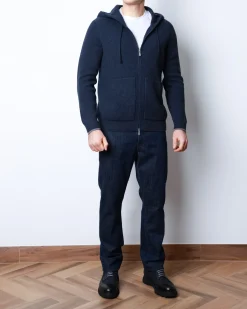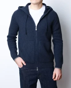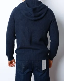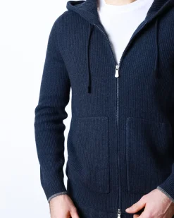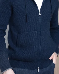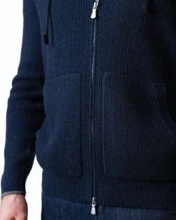 Ребристе плетіння додає текстурності та візуальної глибини, зберігаючи форму навіть після тривалого використання. Кардиган має двосторонню блискавку, капюшон з регулюванням і дві фронтальні кишені — ідеальний баланс практичності й елегантності. Глибокий темно-синій колір підкреслює лаконічність моделі, роблячи її універсальною для міського гардероба.