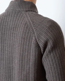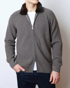 Кардиган із 100% натуральної вовни, має фактурне рубчасте в’язання, двосторонню блискавку та хутряний комір.