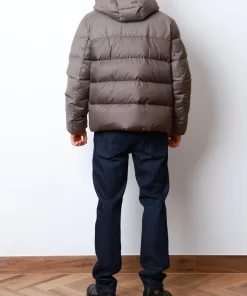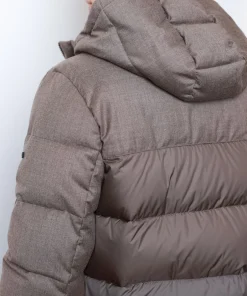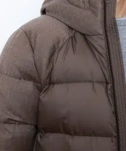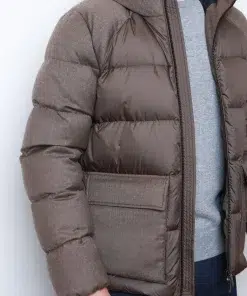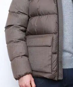 Чоловіча пуховик виконаний з поєднанням вовни Loro Piana та поліаміду. Утеплена 100% натуральним пухом, має об’ємний капюшон, блискавку по центру та великі накладні кишені.