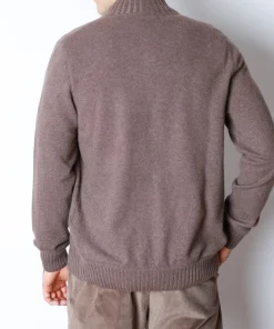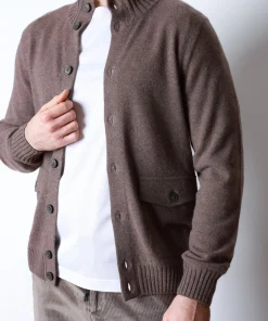 Кашеміровий кардиган Buonamassa у коричневому відтінку. 100% кашемір, комір-стійка, накладні кишені з клапанами, ґудзики з натурального рогу.