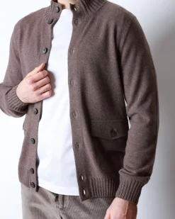 Кашеміровий кардиган Buonamassa у коричневому відтінку. 100% кашемір, комір-стійка, накладні кишені з клапанами, ґудзики з натурального рогу.