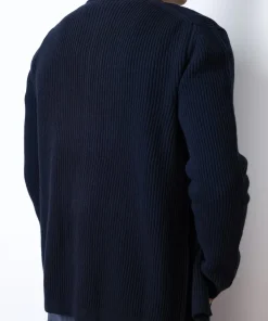 Темно-синій вовняний кардиган 100% вовна, фактурна в’язка, комір-«сорочка», класична застібка на гудзики. Стильна базова річ для сучасного гардероба.