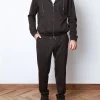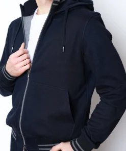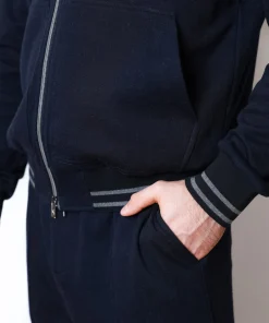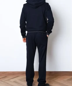 Костюм з м’якої суміші бавовни та кашеміру, темно синього кольору. Модель складається з худі на блискавці та штанів прямого крою