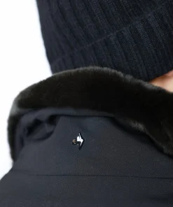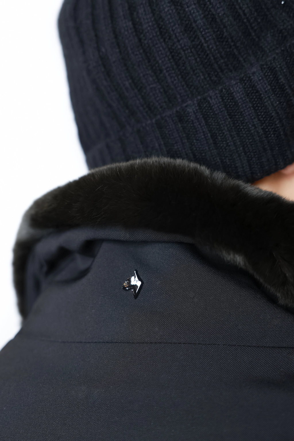 Пуховик із наповнювачем 90% пуху та 10% пера. Виконаний із технологічної тканини AEROTWILL (91% поліестер, 9% еластан). Має знімний комір із натурального хутра кролика рекс, куліску всередині та водо- й вітрозахисні властивості.