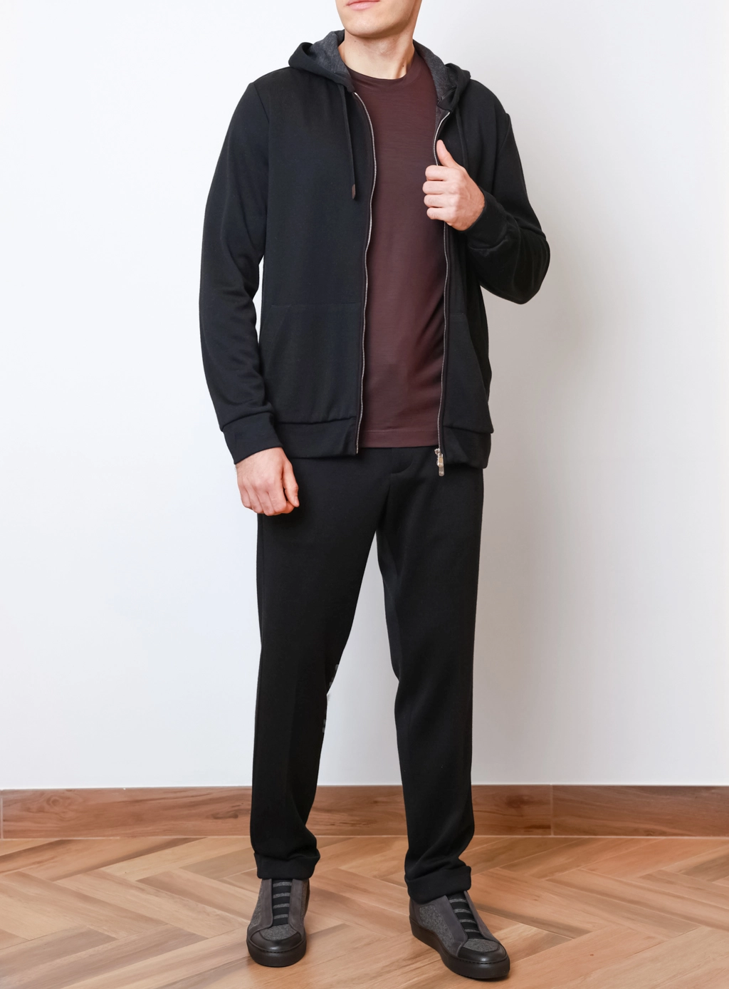 ✖Чоловічий спортивний костюм Marco Pescarolo у чорному кольорі — це поєднання елегантності італійського стилю та комфорту. Виконаний із преміальної тканини (98% шерсть, 2% поліамід), він вирізняється м’якою фактурою, відмінною посадкою та сучасним мінімалістичним дизайном.