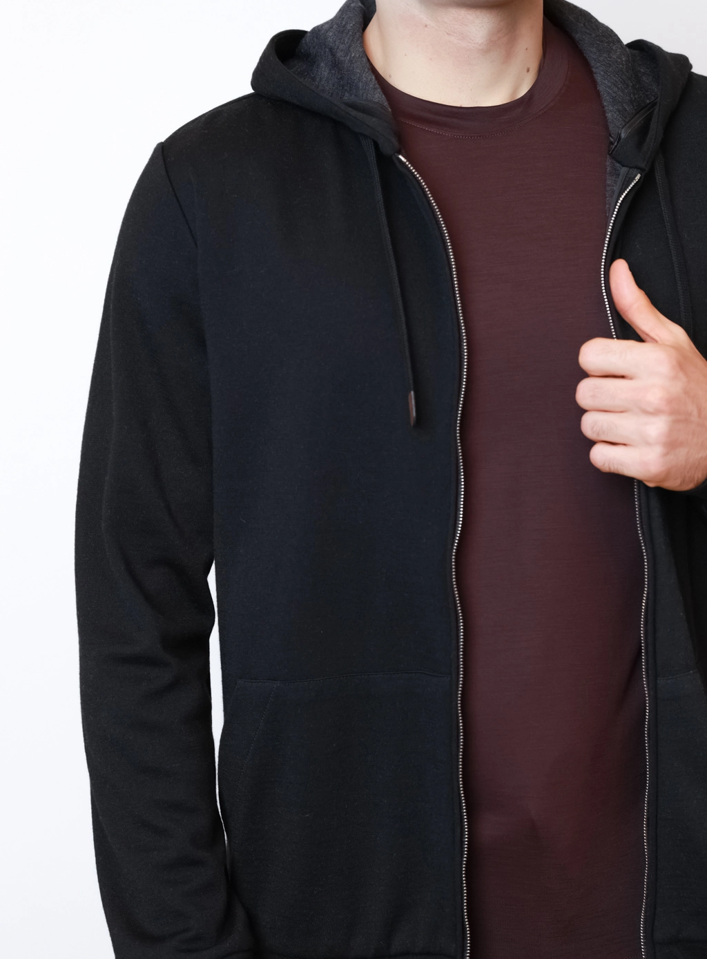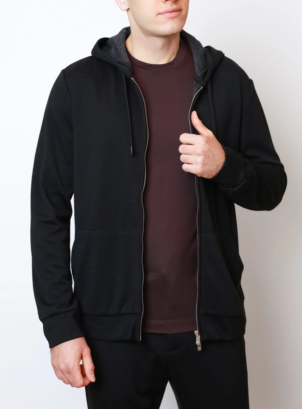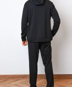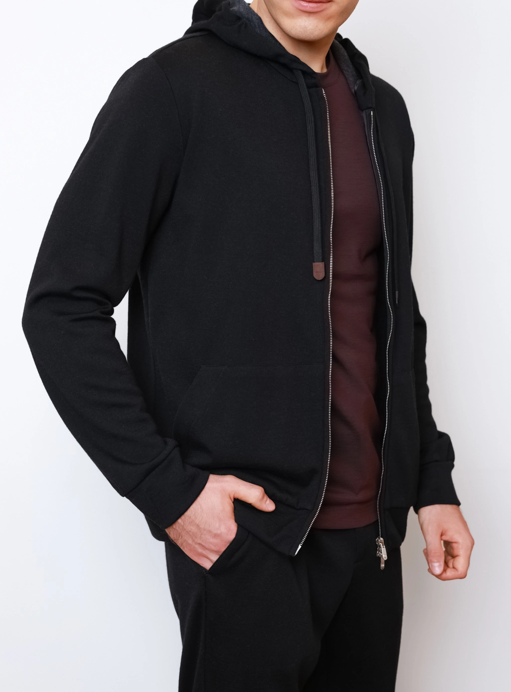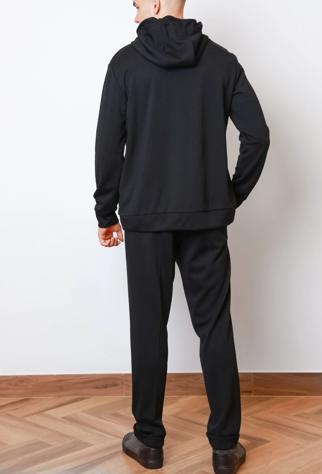 Верх виконаний у формі худі на блискавці з капюшоном, який регулюється кулісою зі шнурками. Центральна застібка має два бігунки, що додає зручності у використанні. Спереду розташовані зручні врізні кишені, а манжети та низ оздоблені еластичним трикотажем, який надійно тримає форму. Брюки прямого крою з класичною посадкою, еластичним поясом і кулісою для регулювання забезпечують ідеальну посадку та комфорт. Модель доповнена двома боковими врізними та однією задньою кишенею. Низ брюк виконаний без манжетів, що робить образ універсальним і дозволяє поєднувати його як зі спортивним, так і з більш елегантним взуттям.