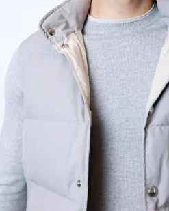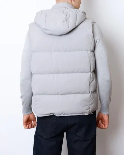Жилет зі змішаною вовняною тканиною ( 54% вовна, 36 поліамід) та наповненням з натурального пуху (90% пух, 10% перо). Має капюшон, дві кишені, класичний світло-сірий колір — стиль і комфорт для щоденного образу.