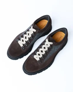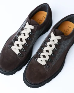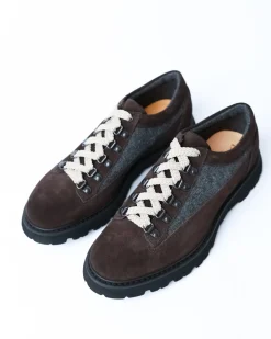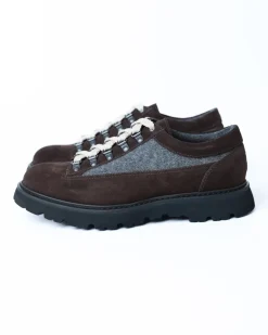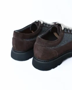 ✖Чоловічі черевики Derby Doucal’s —виконана з натуральної замші темно-коричневого кольору, доповнена вставками з щільної вовняної тканини сірого відтінку, що надає взуттю глибини та контрасту.