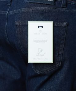Темно-синій відтінок деніму з легким відблиском створює універсальний вигляд, який підходить як для ділового кежуалу, так і для подорожей. Джинси мають п’ять кишень, класичний крій і фірмові металеві заклепки з гравіюванням бренду. На задній кишені — тиснений логотип RJB та фірмова шкіряна нашивка Richard J. Brown.