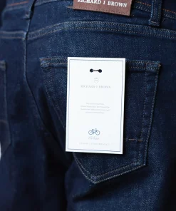 Модель має прямий крій із класичною середньою посадкою — універсальний фасон, який пасує більшості типів фігур. Джинси мають п’ять кишень, включно з маленькою кишенькою для дрібниць, прикрашеною вишитим логотипом RJB. На задніх кишенях — аккуратна строчка. Шкіряний патч із тисненням “RICHARD J. BROWN”, що підкреслює преміальний статус бренду.