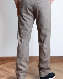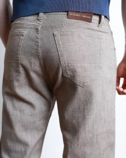 Джинси Richard J Brown зручного крою, виконані з еластичної шоколадно-коричневої тканини, мають стильні деталі, такі як ручне прошивання на кишенях і додаткові ґудзики, а також виготовлені в Італії.