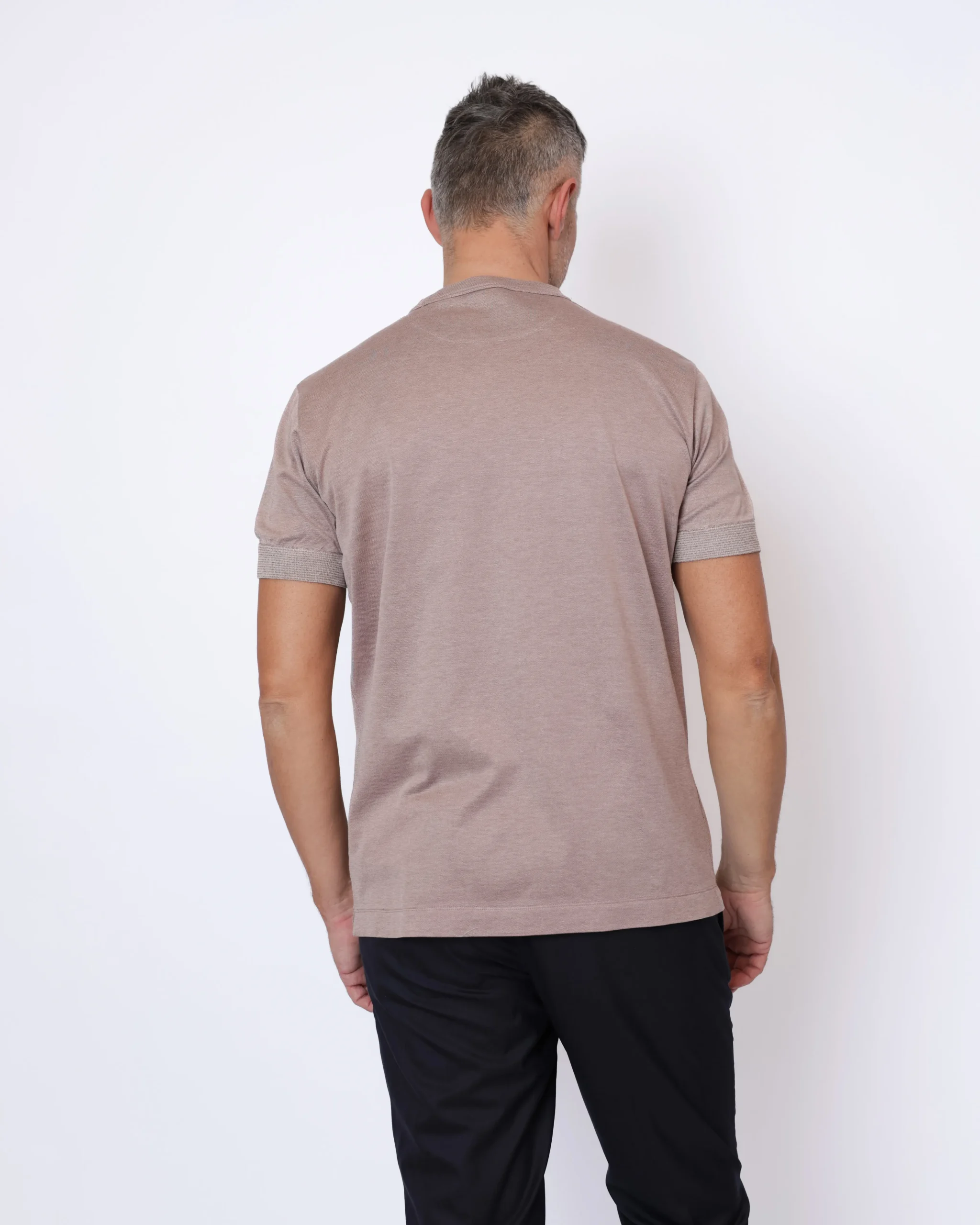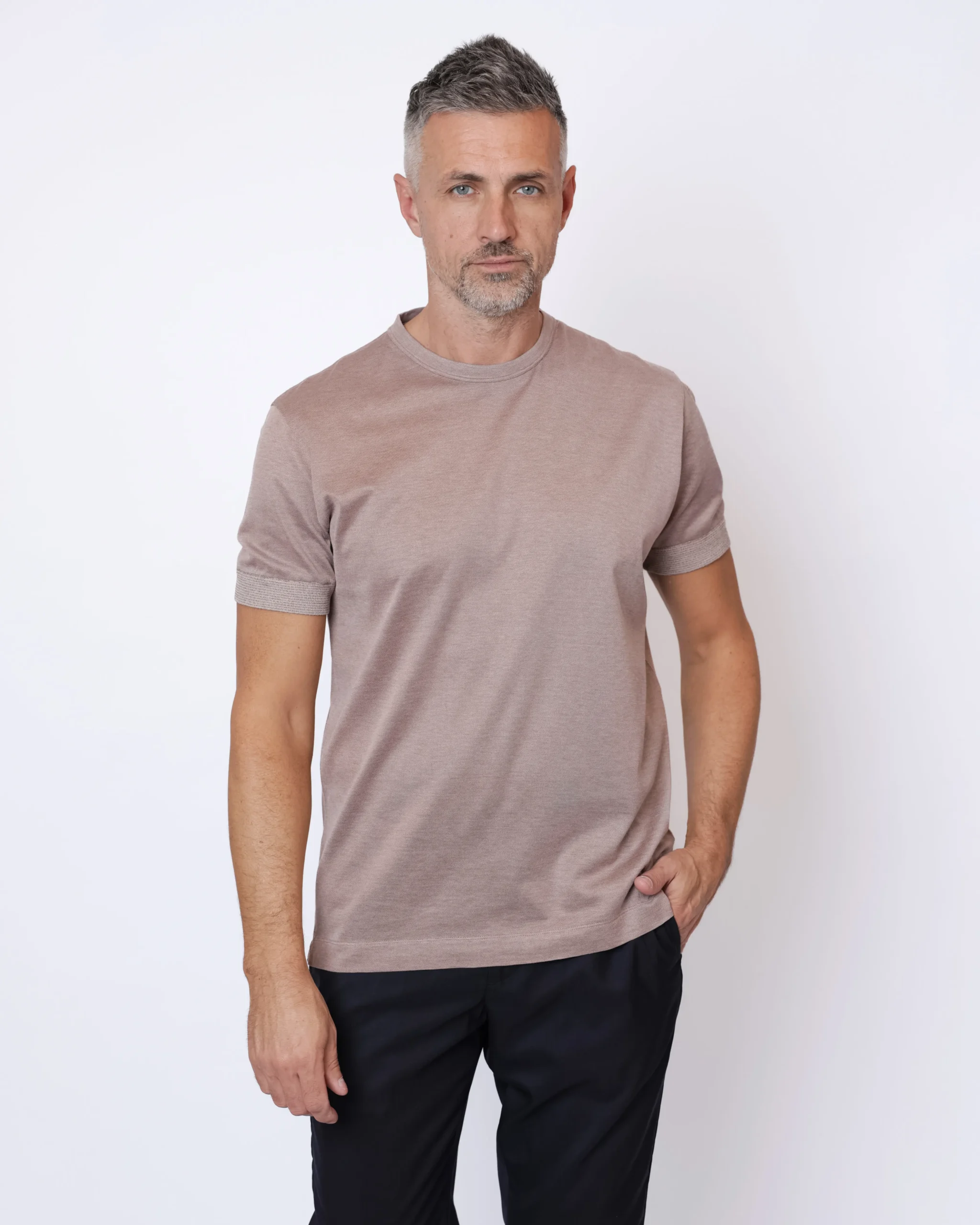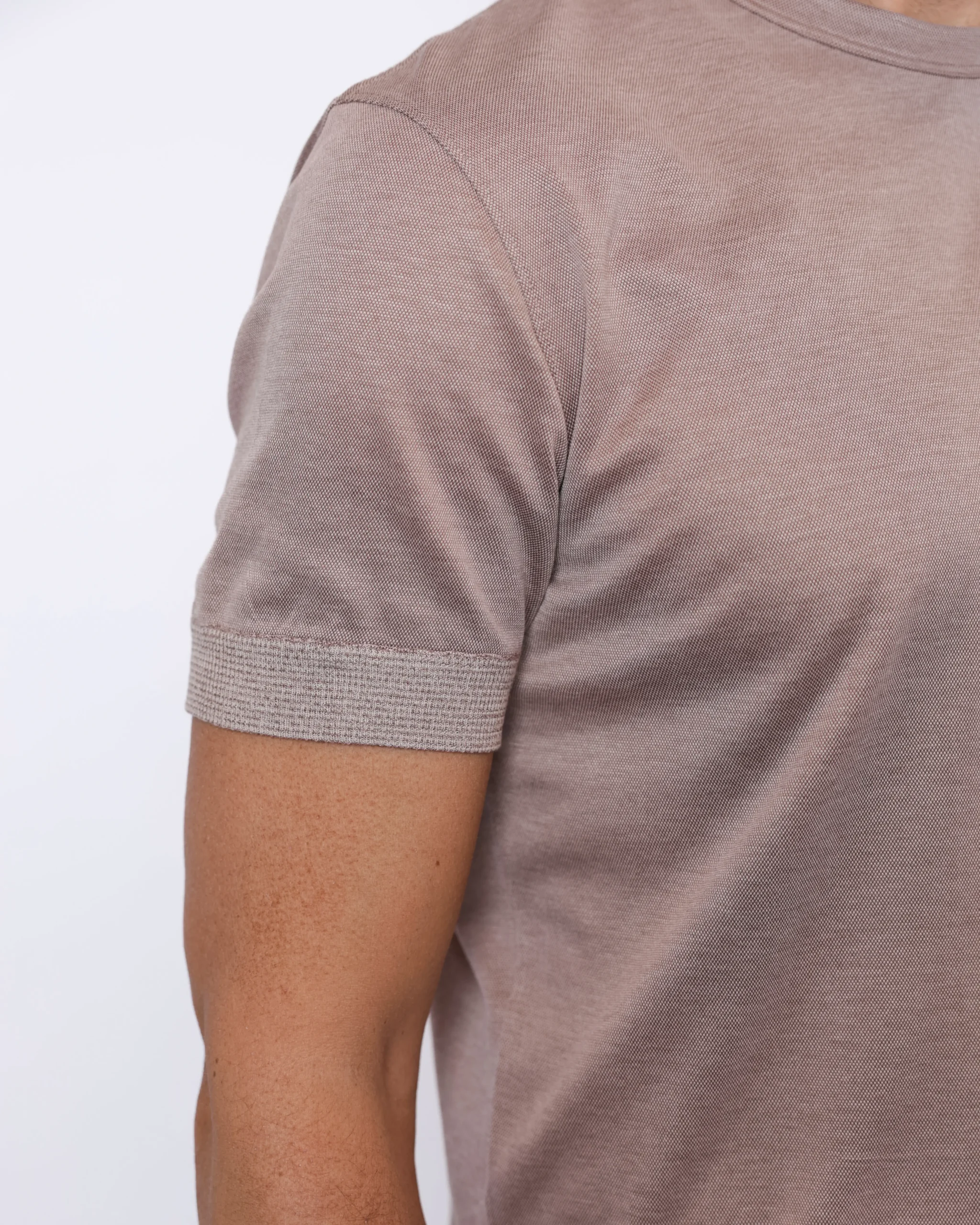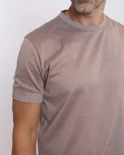 Лаконічна футболка Cortigiani виконана з легкого трикотажу на основі шовку та бавовни. Тканина має м’яку гладку поверхню з делікатною фактурою та благородним матовим блиском.