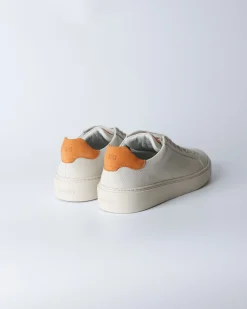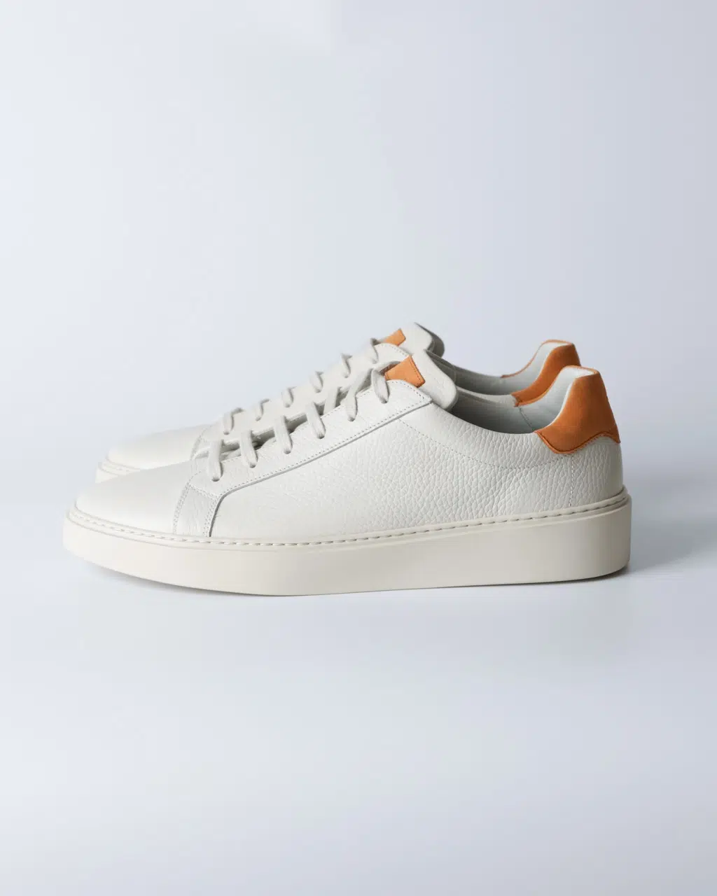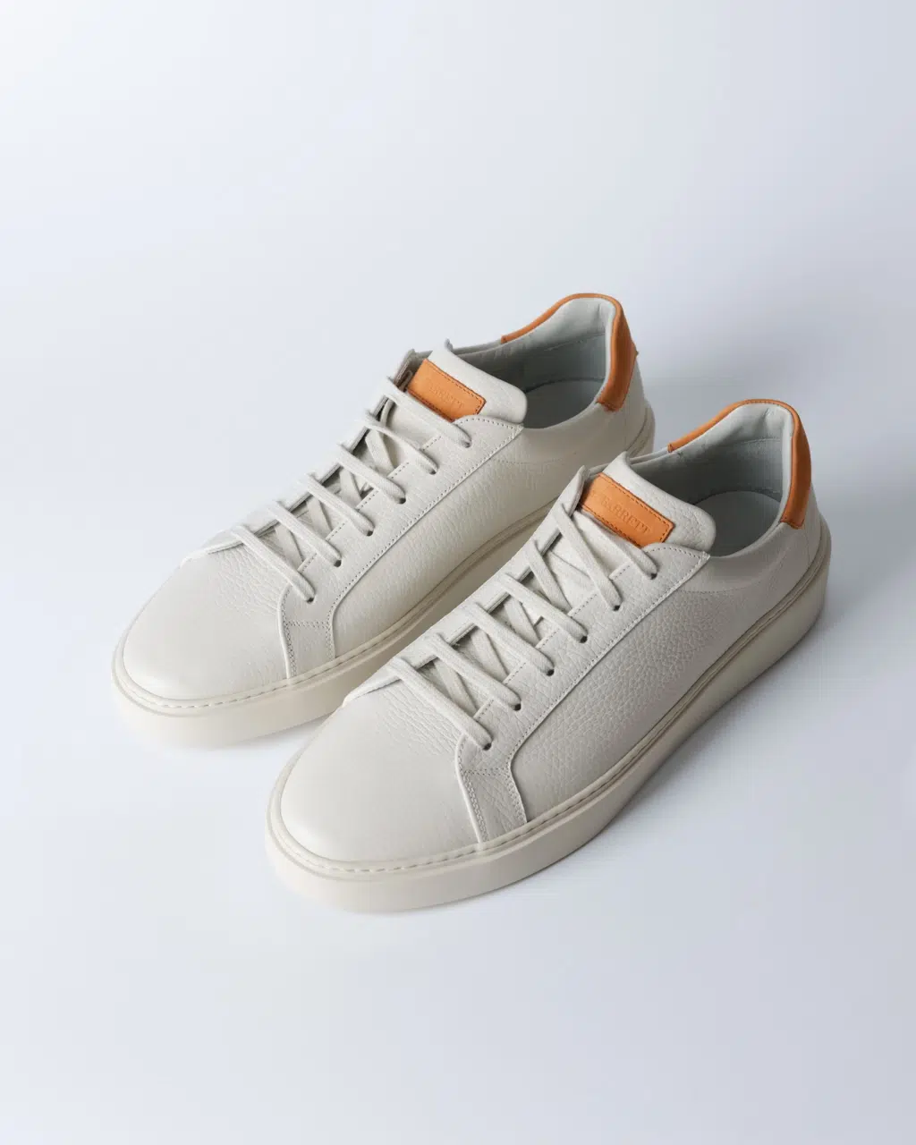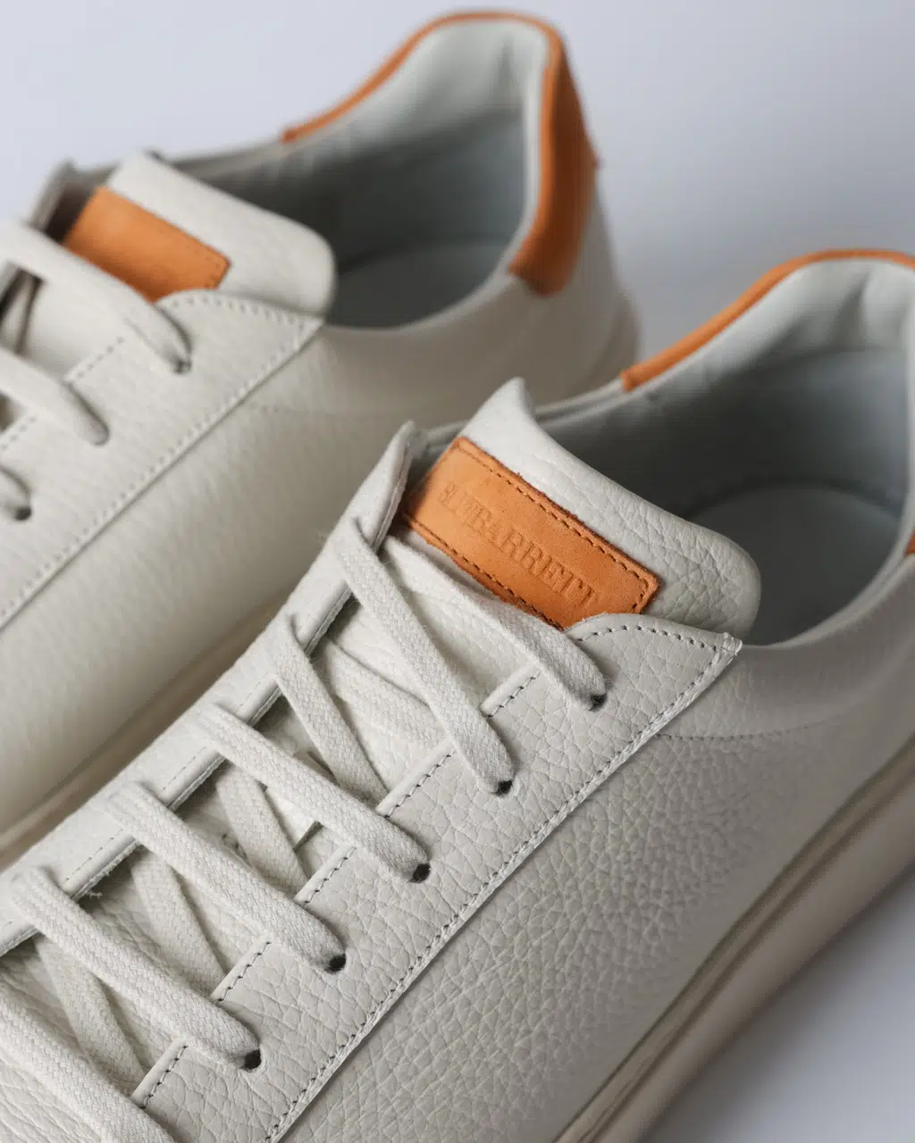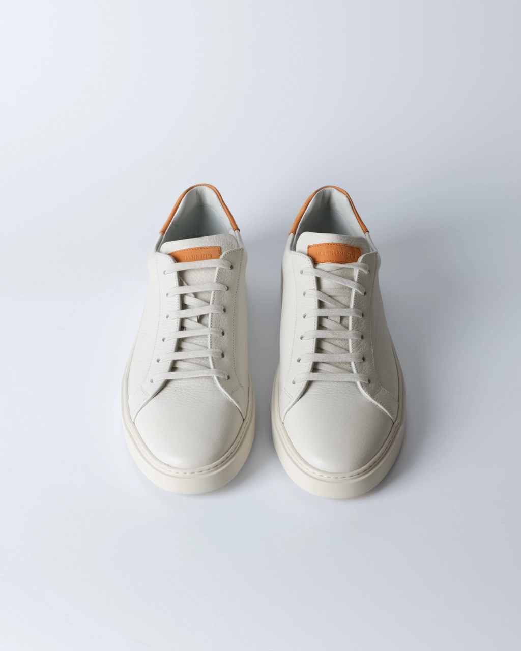 Кросівки Barrett з фактурної натуральної шкіри у молочно-білому відтінку з контрастними карамельними шкіряними вставками на язичку та п’ятці. Лаконічний силует доповнений масивною світлою підошвою та класичною шнурівкою.