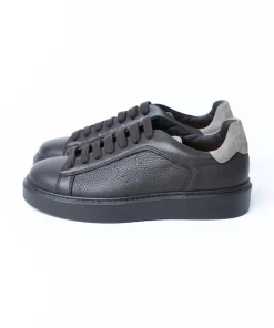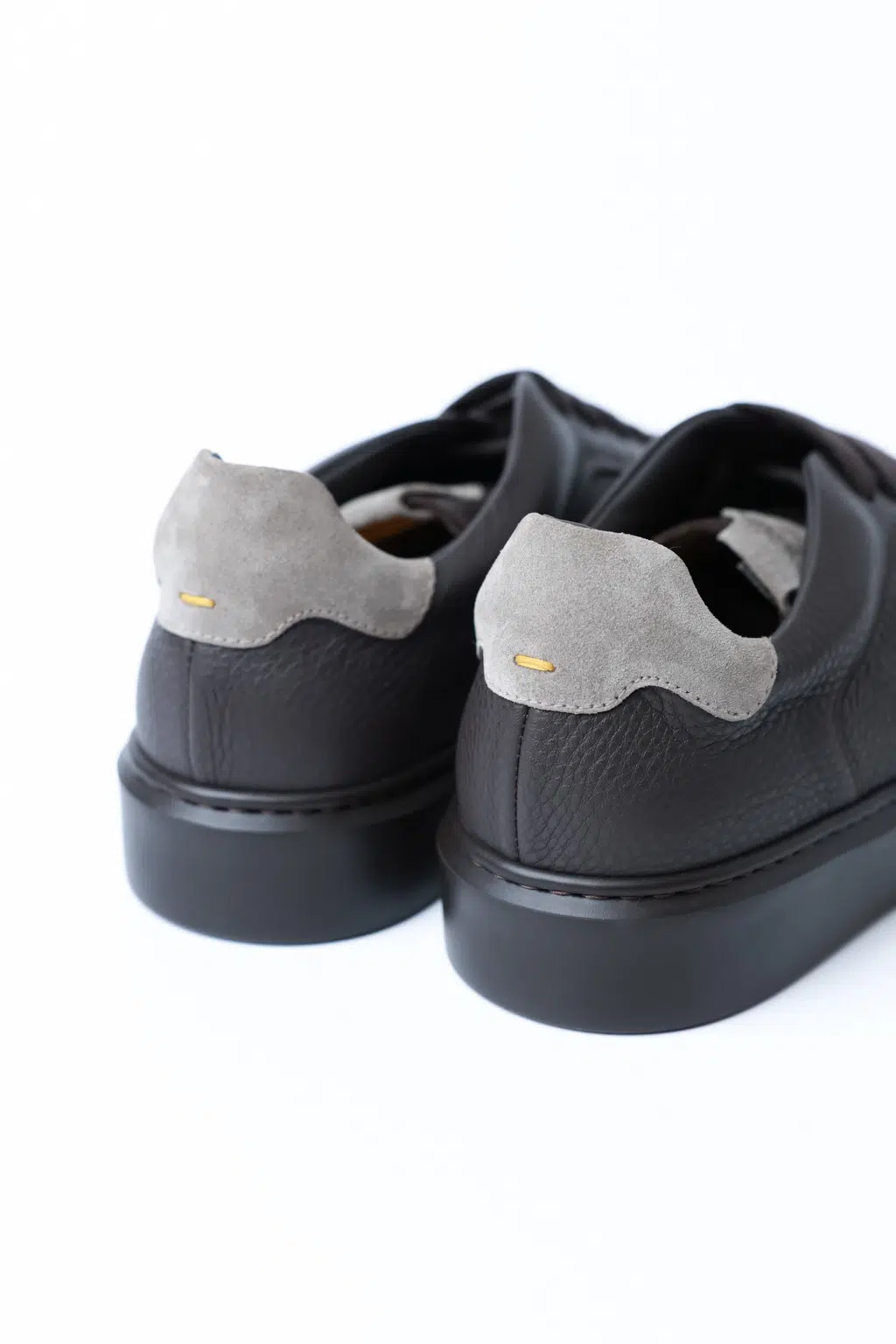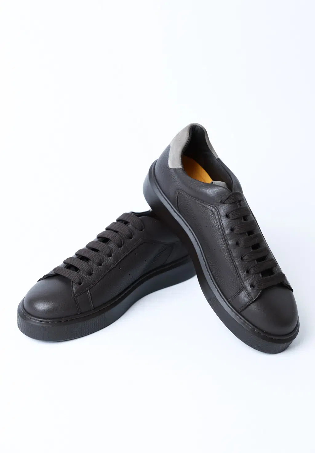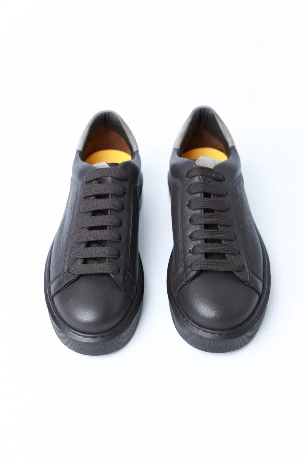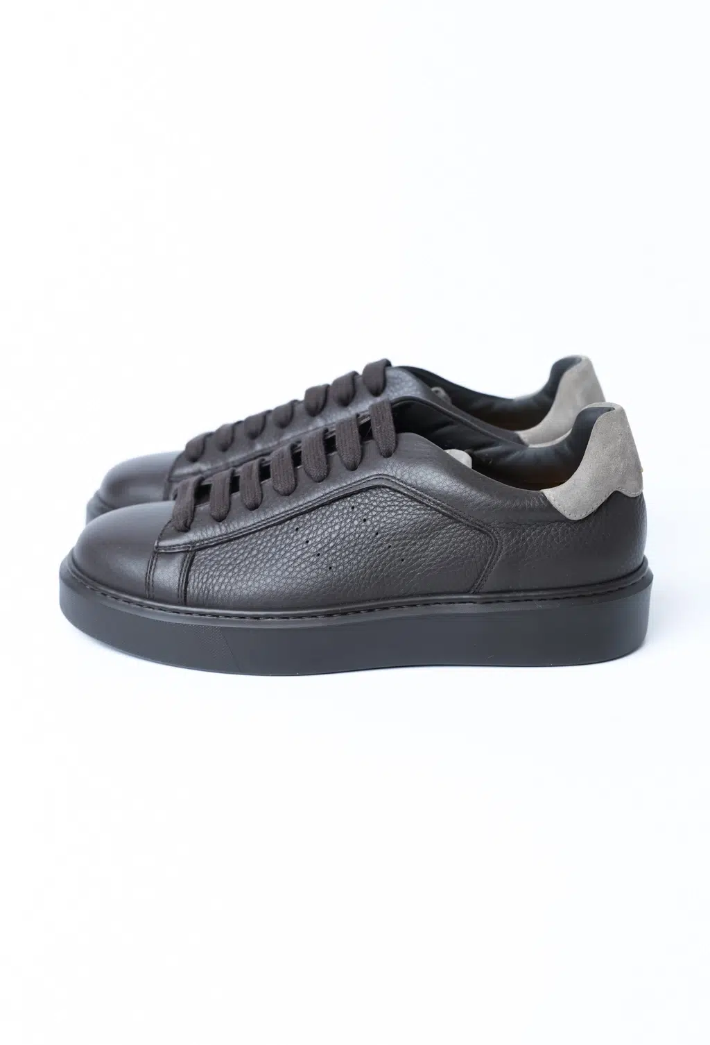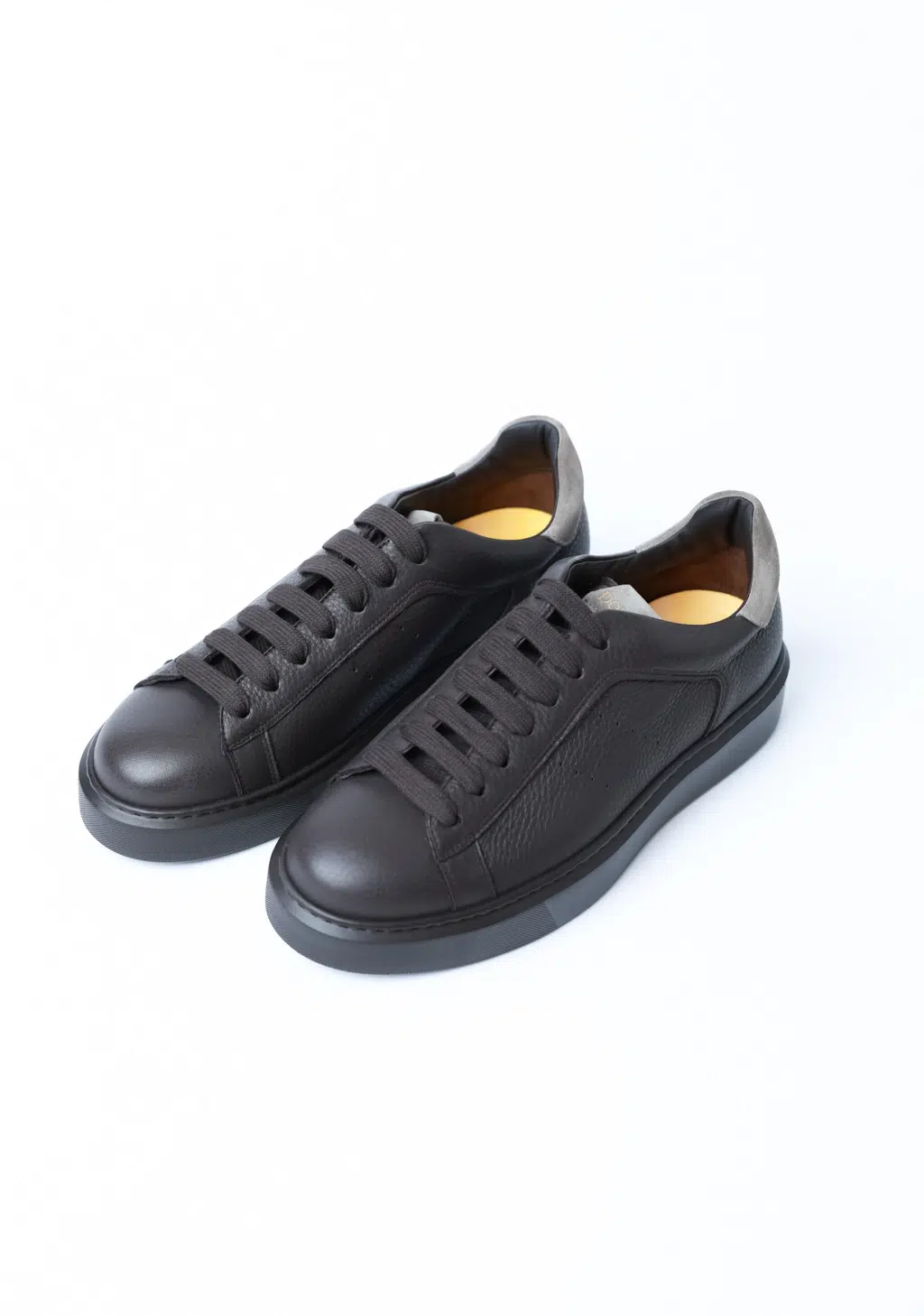 ✖Кеди Doucal’s виготовлені з 100% натуральної шкіри преміум-якості з вираженою зернистою текстурою. Відтінок — насичений темно-шоколадний, який гармонійно поєднується з світло-сірими замшевими вставками на п’яті, створюючи стриманий, але елегантний контраст.