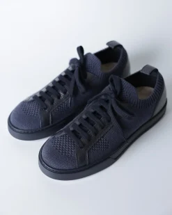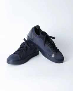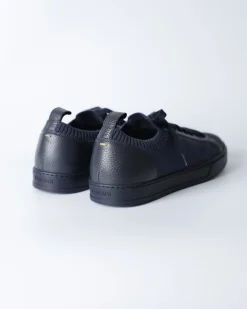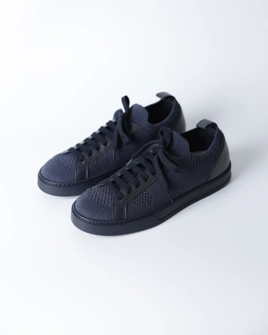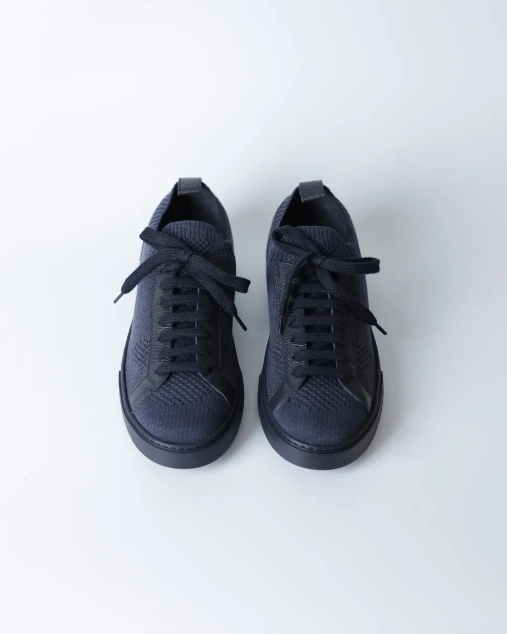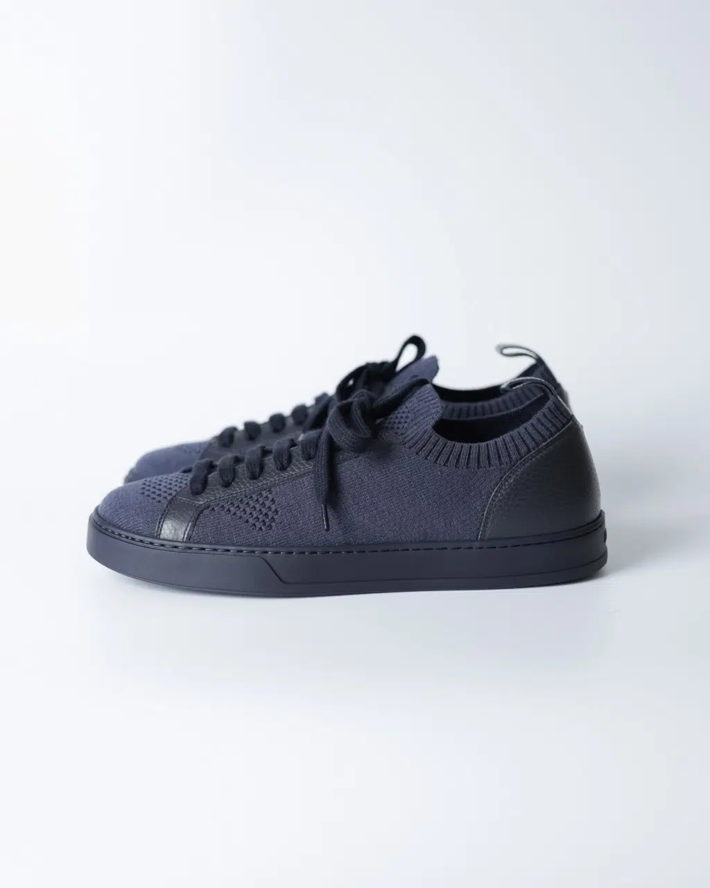 Це кросівки Doucal’s у темно-синьому відтінку — дуже глибокий синій, який при слабкому освітленні може виглядати майже чорним. Верх виконаний із дихаючого трикотажу з еластичною манжетою біля щиколотки для комфортної посадки.