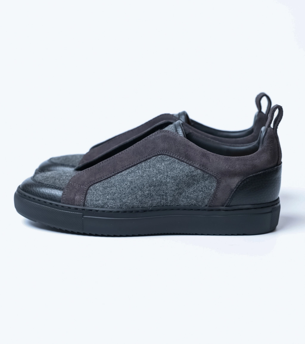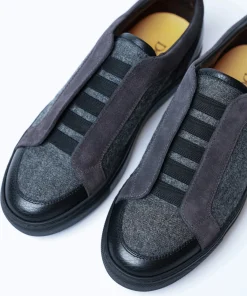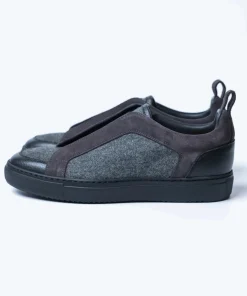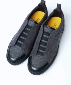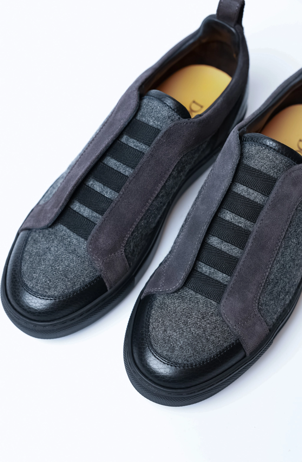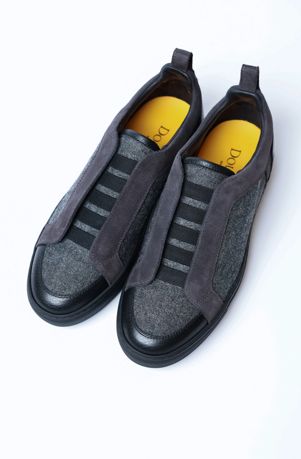 Шкіряні кеди Doucal’s з комбінацією замші та вовняного текстилю. Зручна модель без шнурівки з еластичними вставками, підкладка зі 100% телячої шкіри та міцна гумова підошва.