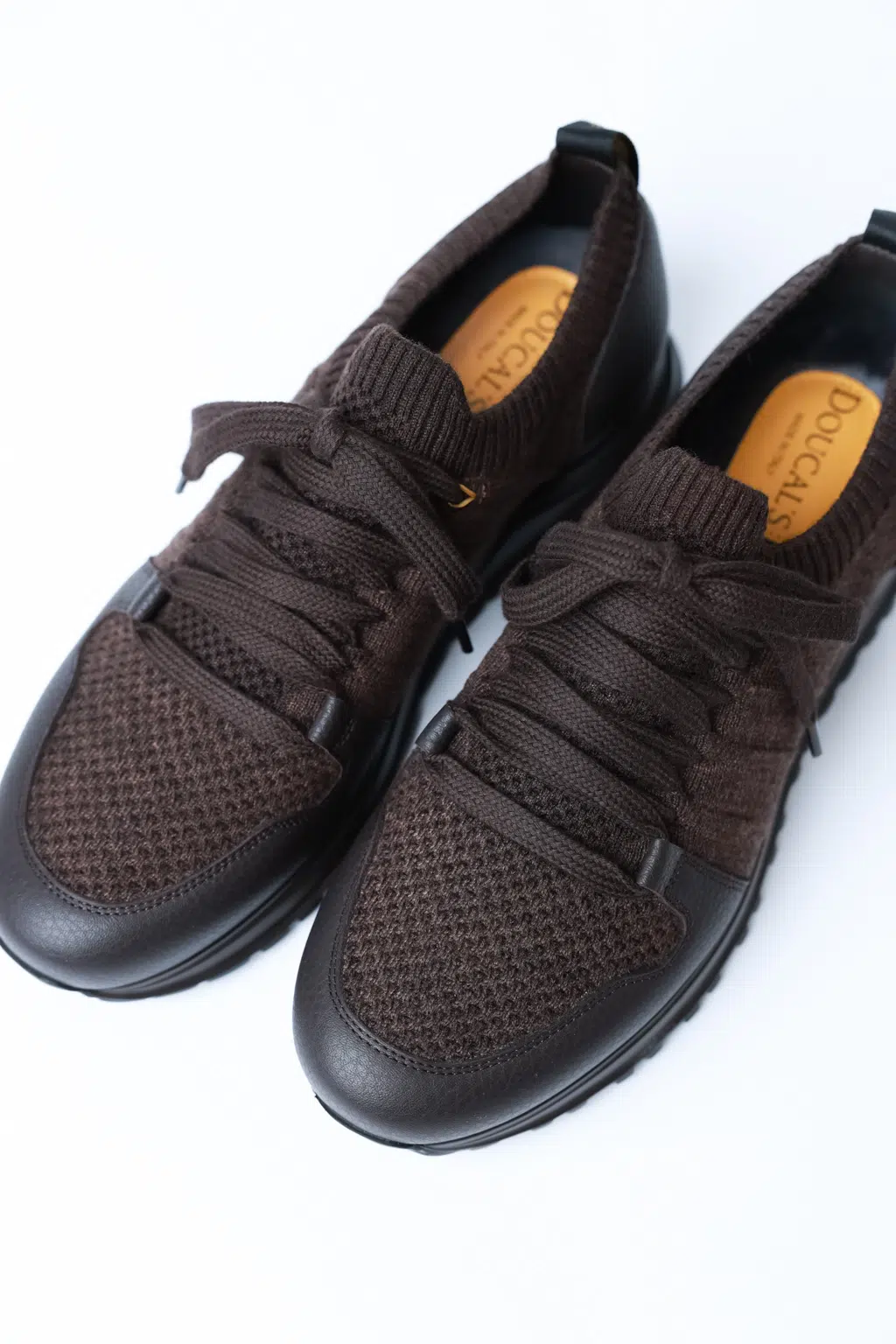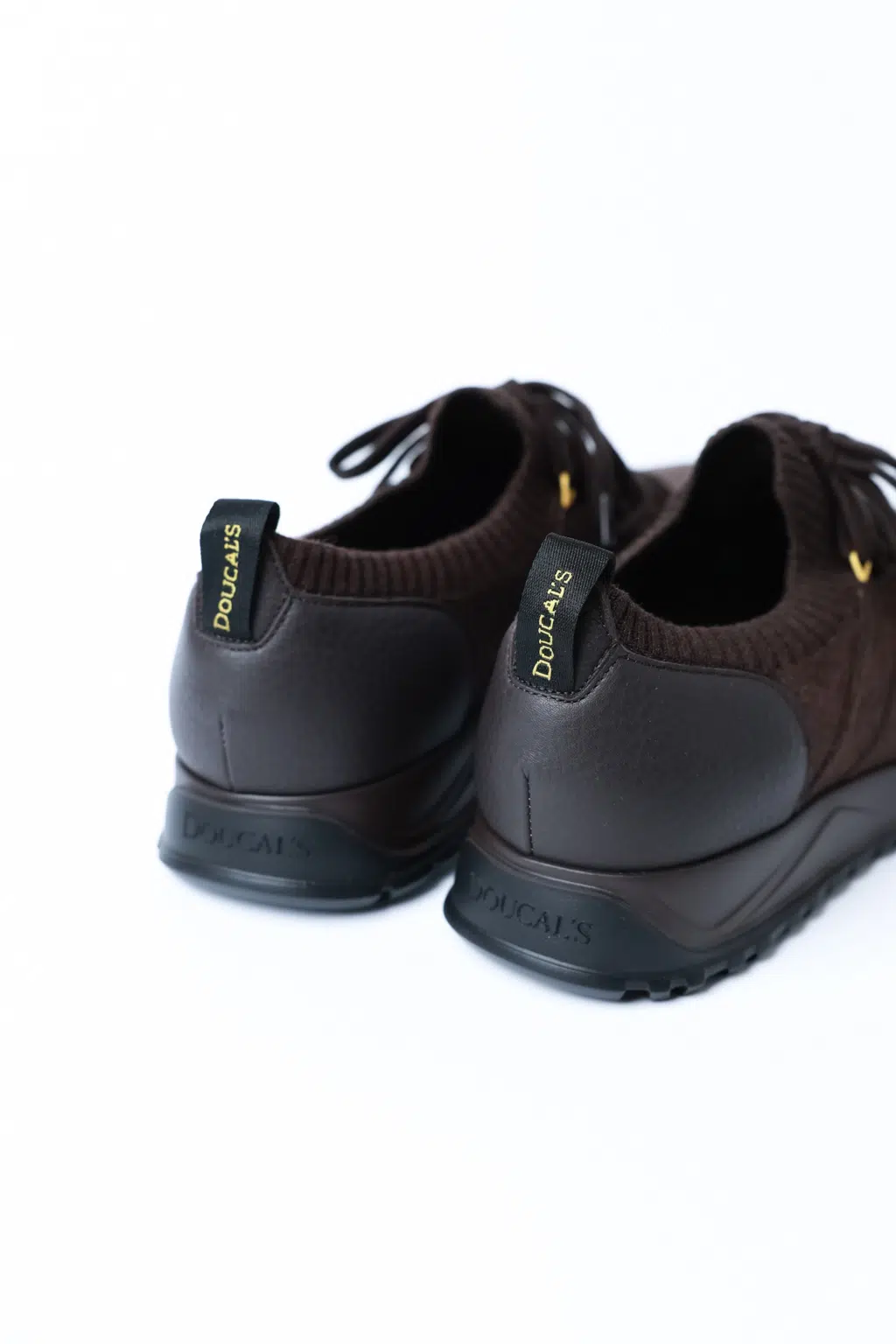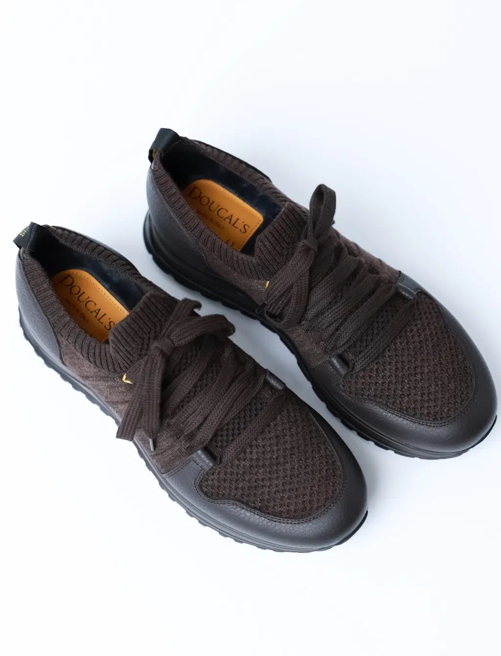 Шнурівка виконана з широких щільних шнурків у тон взуття, що дозволяє зручно регулювати об’єм. На задній частині моделі розташована петелька з фірмовим написом Doucal’s у золотистому кольорі — акцент, який підкреслює преміальне походження пари.