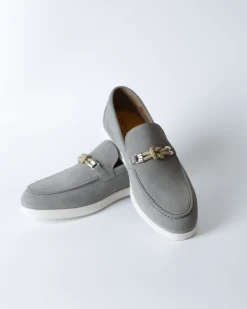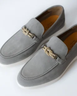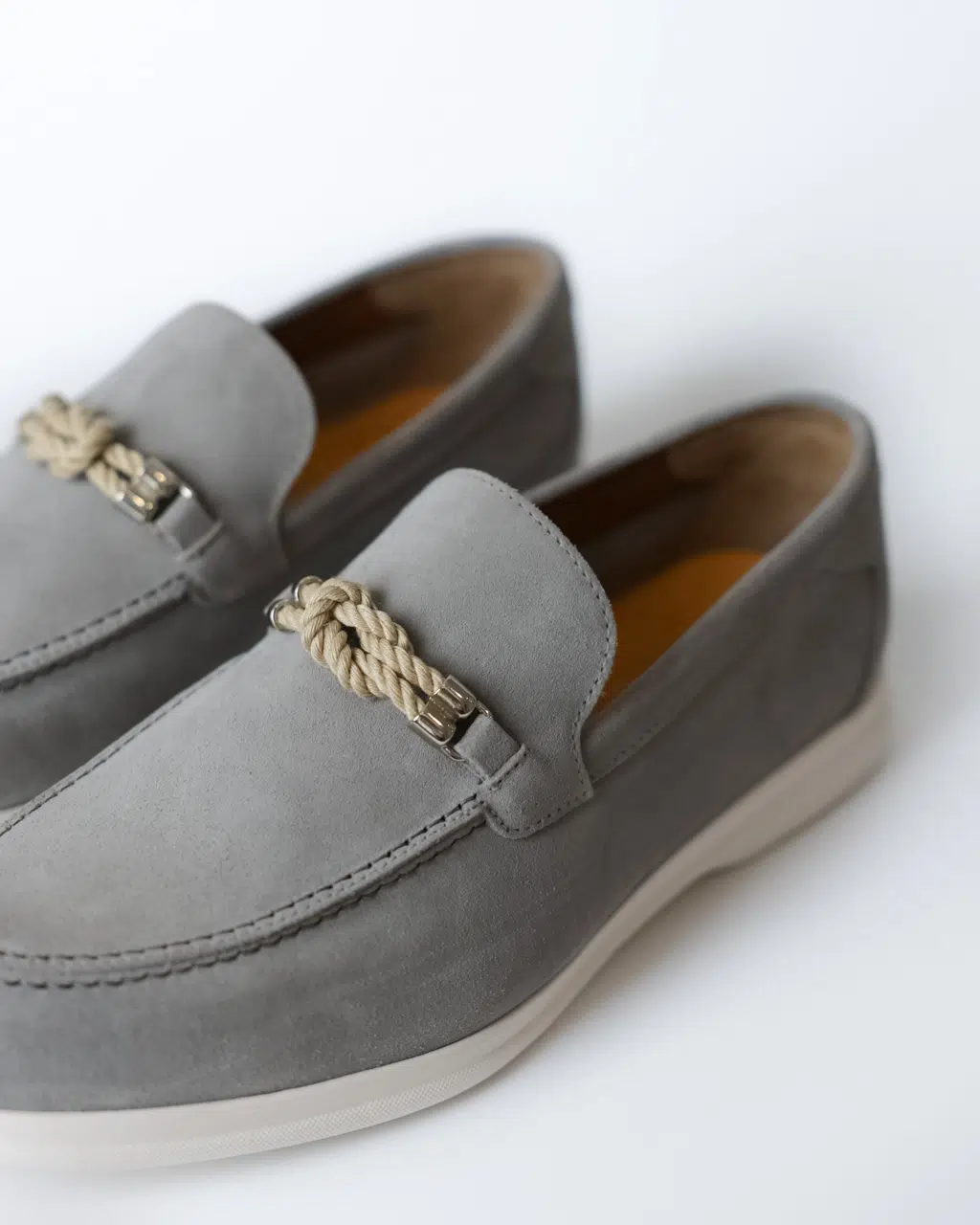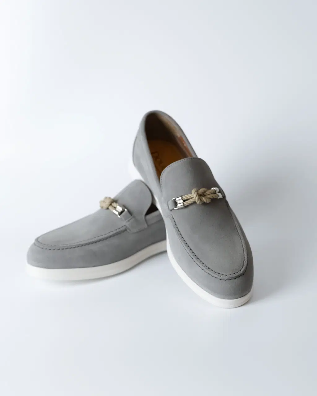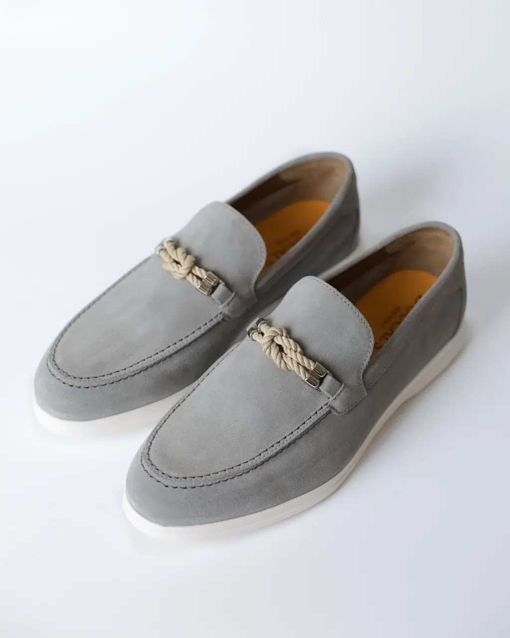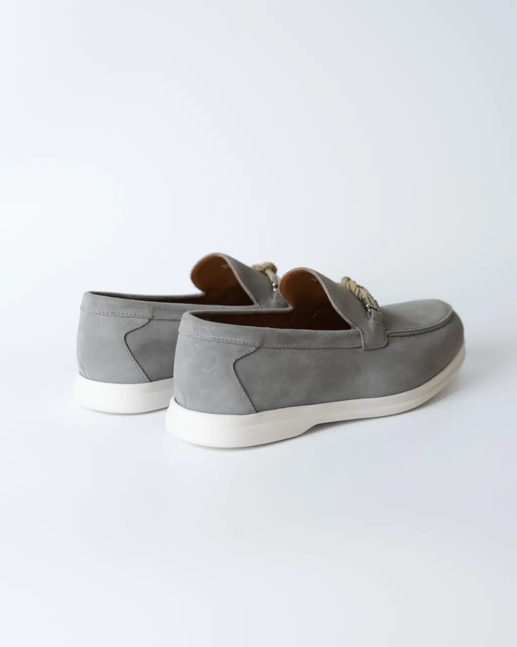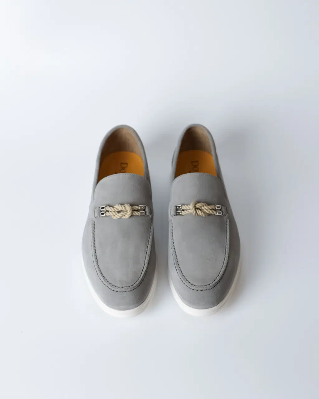 Лофери Doucal’s із натуральної замші світло-сірого відтінку з декоративною плетеною перемичкою, світлою гумовою підошвою та шкіряною підкладкою.