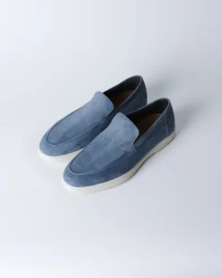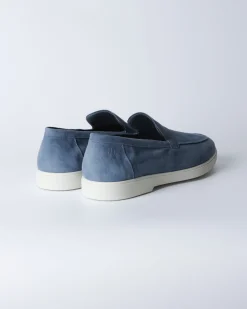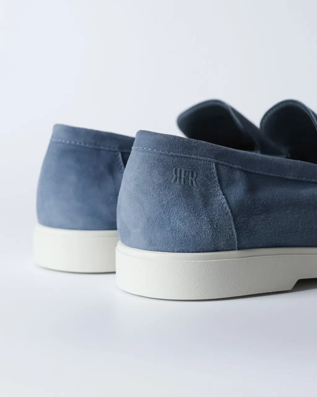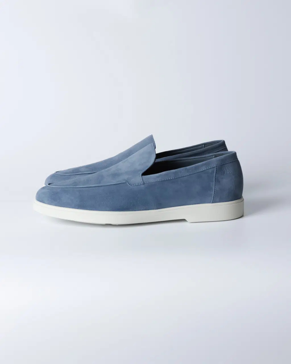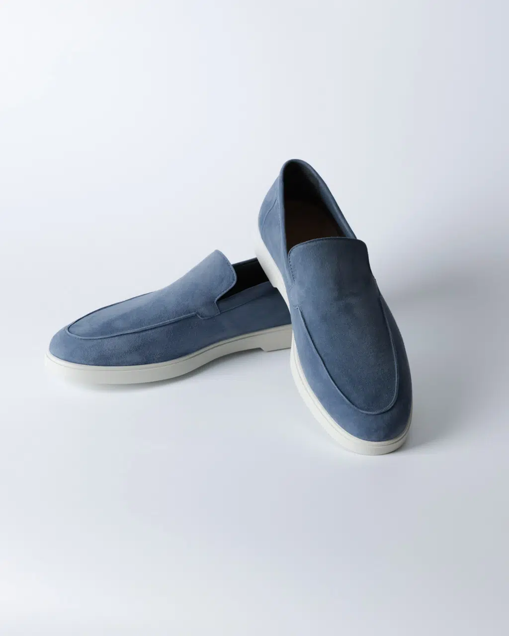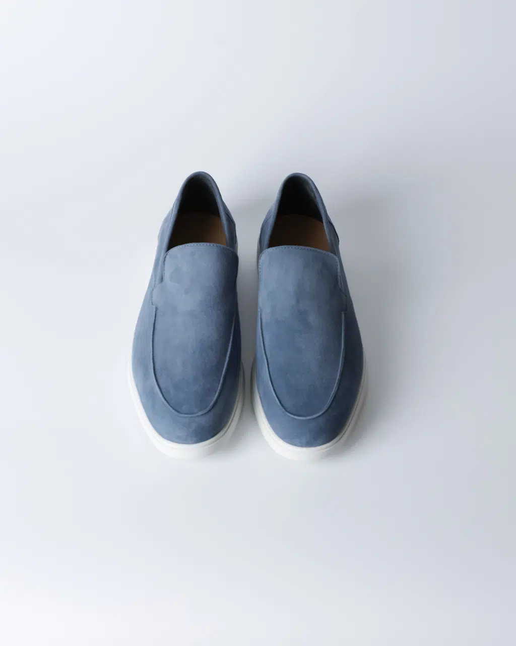 Лофери з м’якої замші у холодному блакитному відтінку з лаконічною верхньою лінією та контрастною білою підошвою. Силует чистий, мінімалістичний, без зайвих деталей — акцент на кольорі та фактурі.