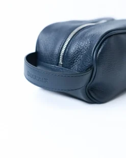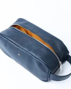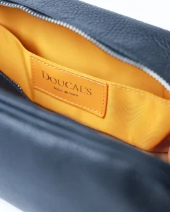 Несесер Doucal’s із м’якої шкіри насиченого синього кольору. Усередині — підкладка жовтого кольору та кишеня для дрібниць, зручна шкіряна ручка на зап’ястя та металева блискавка.