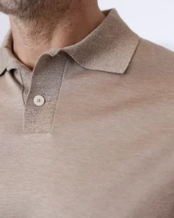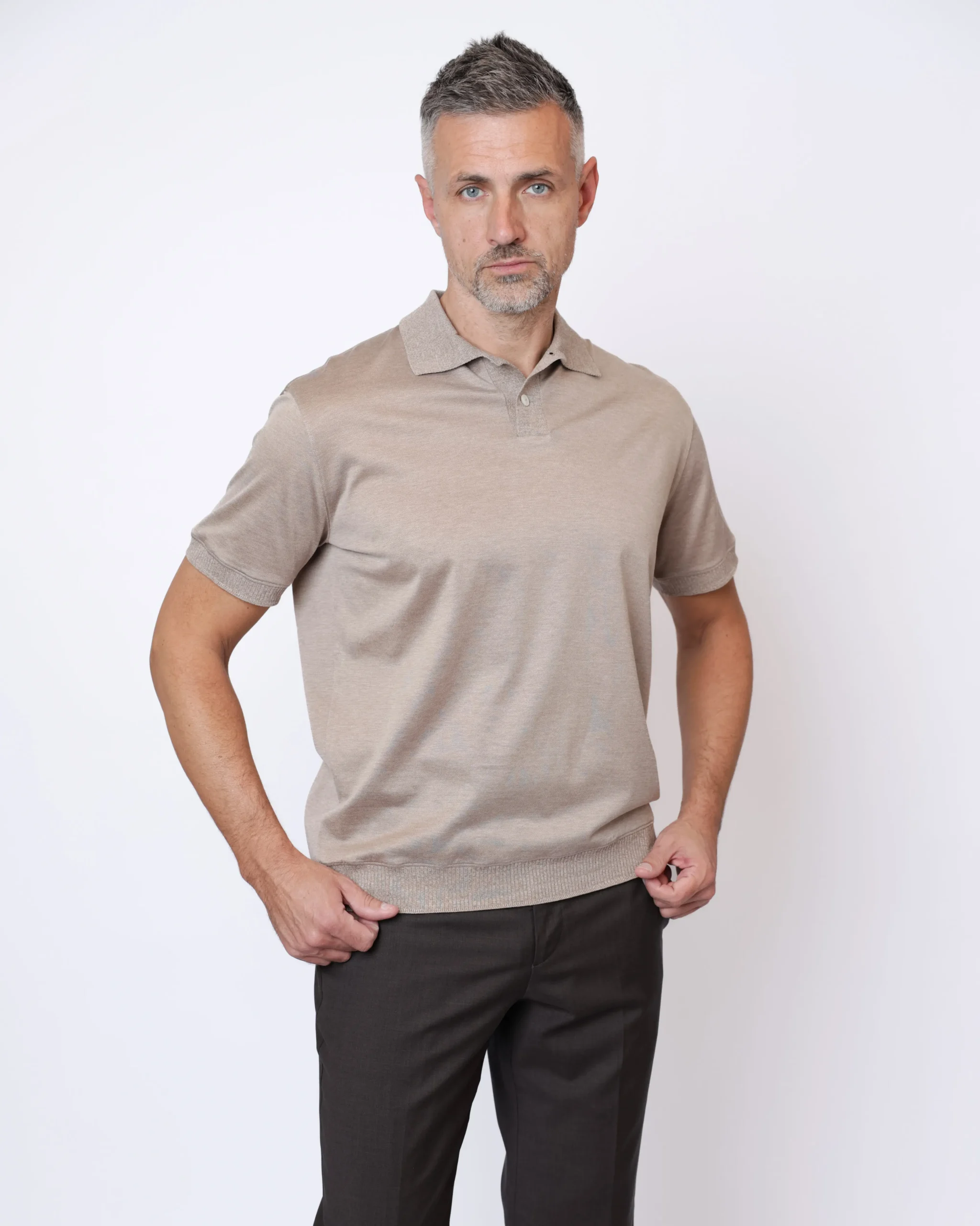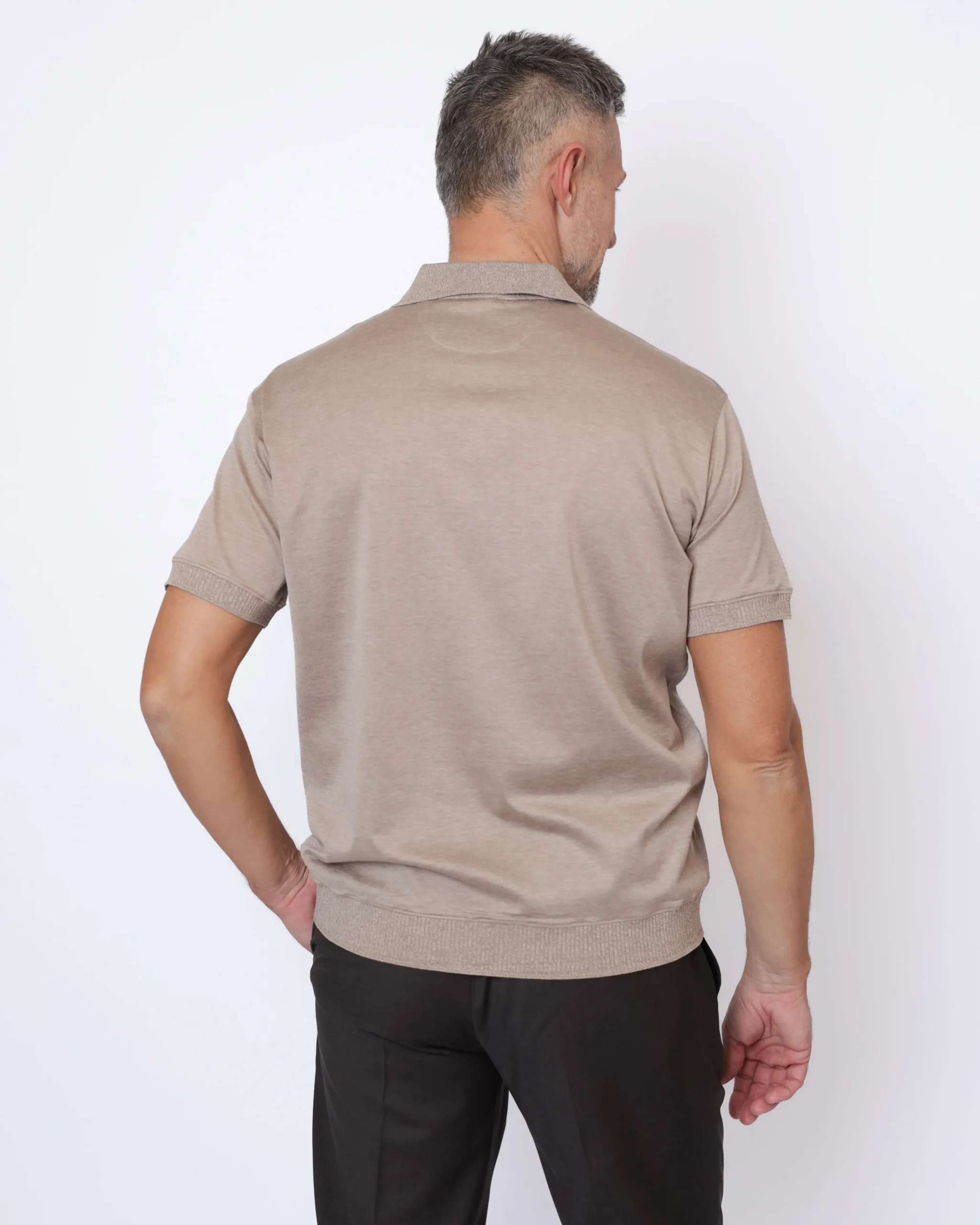 Елегантне поло з тонкого трикотажу на основі бавовни та шовку. Тканина має гладку, майже шовковисту поверхню з делікатною природною текстурою. Еластичні манжети рукавів та пояс унизу виробу.
