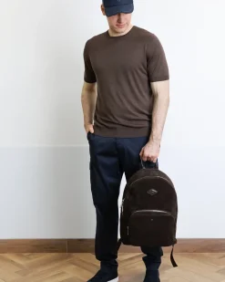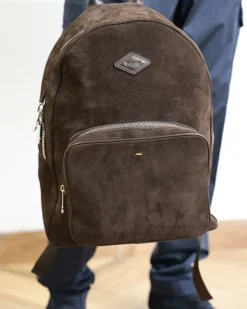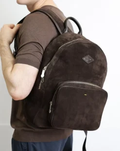 Темно-коричневий рюкзак Doucal’s із натуральної замші з функціональними відділеннями, сріблястою фурнітурою та зручними ручками поєднує стиль і практичність, ідеально доповнюючи сучасний образ.