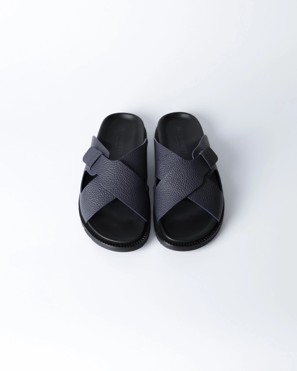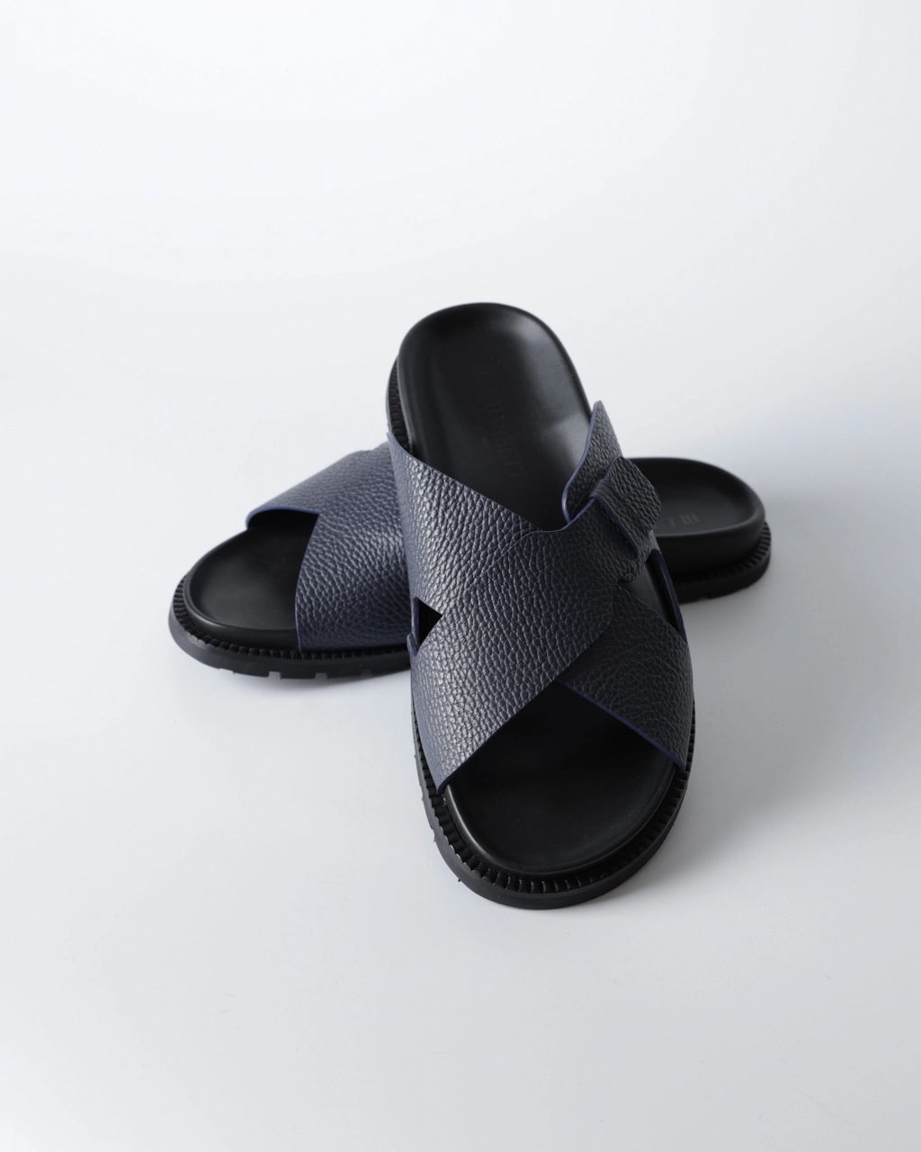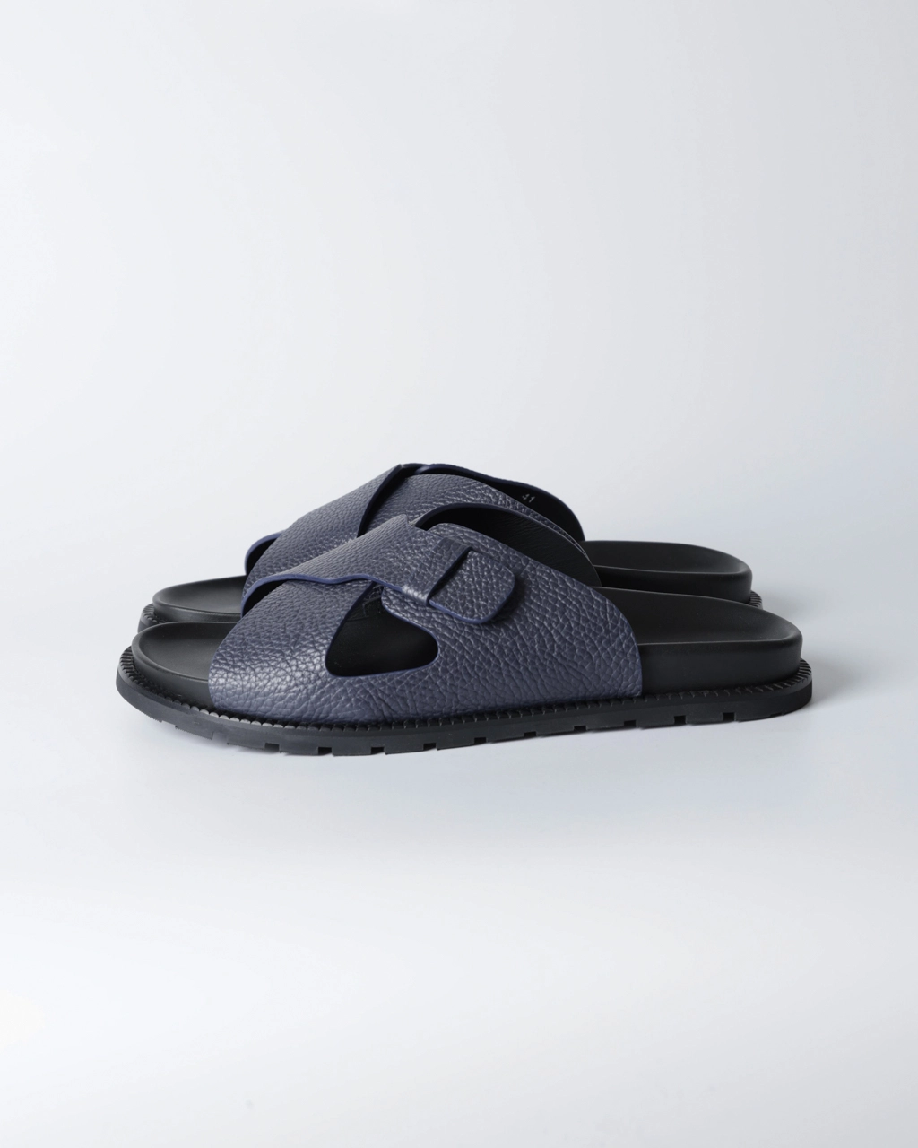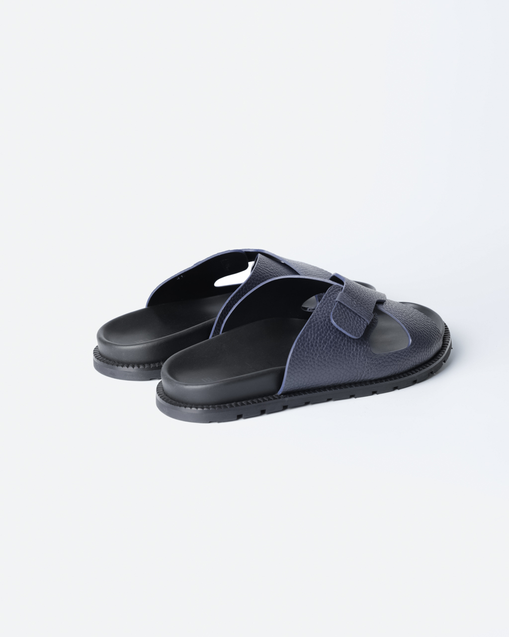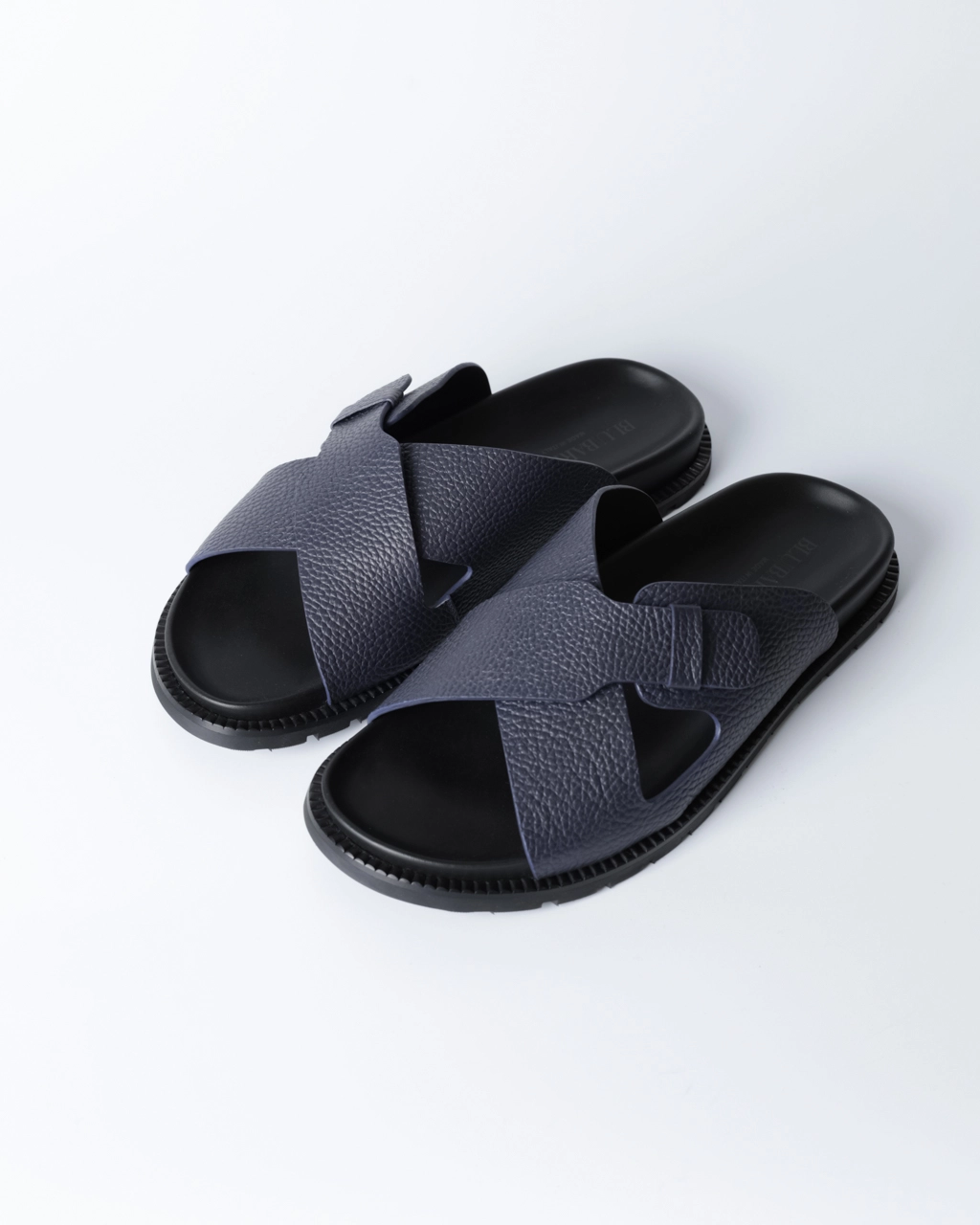 Шльопанці із casual-лінії Blu Barrett з натуральної зернистої шкіри глибокого темно-синього відтінку. Модель з перехресними ремінцями, анатомічною устілкою та легкою гумовою підошвою.